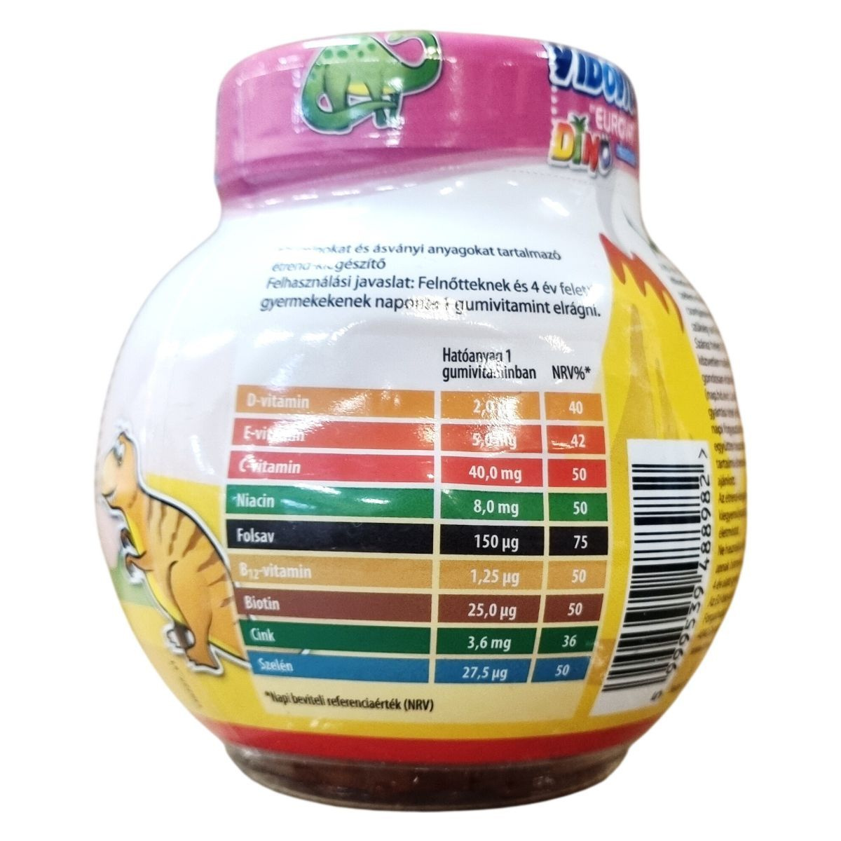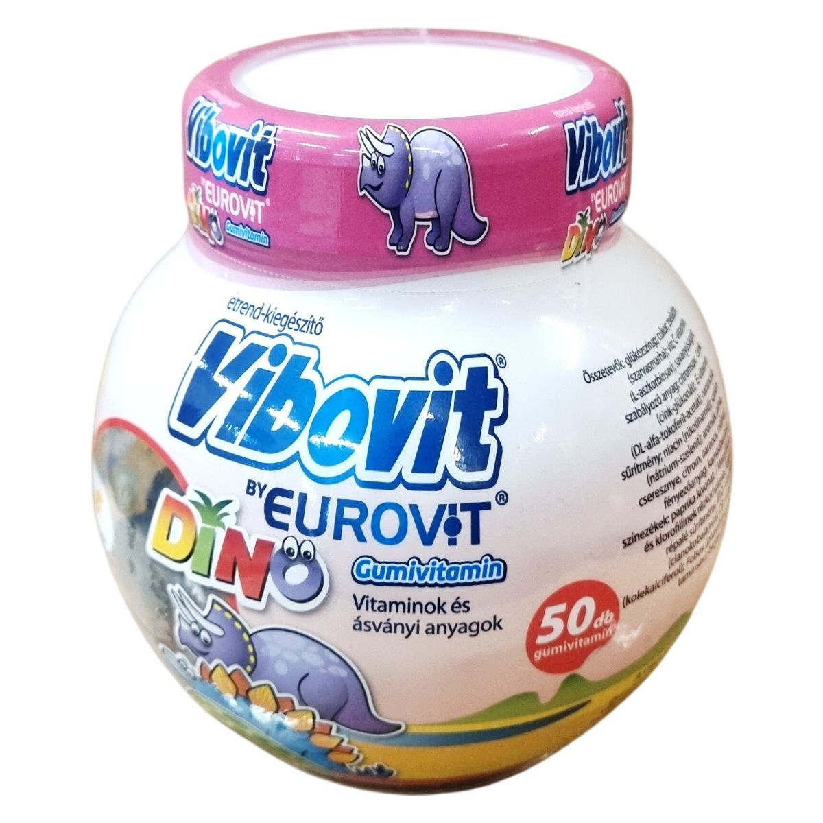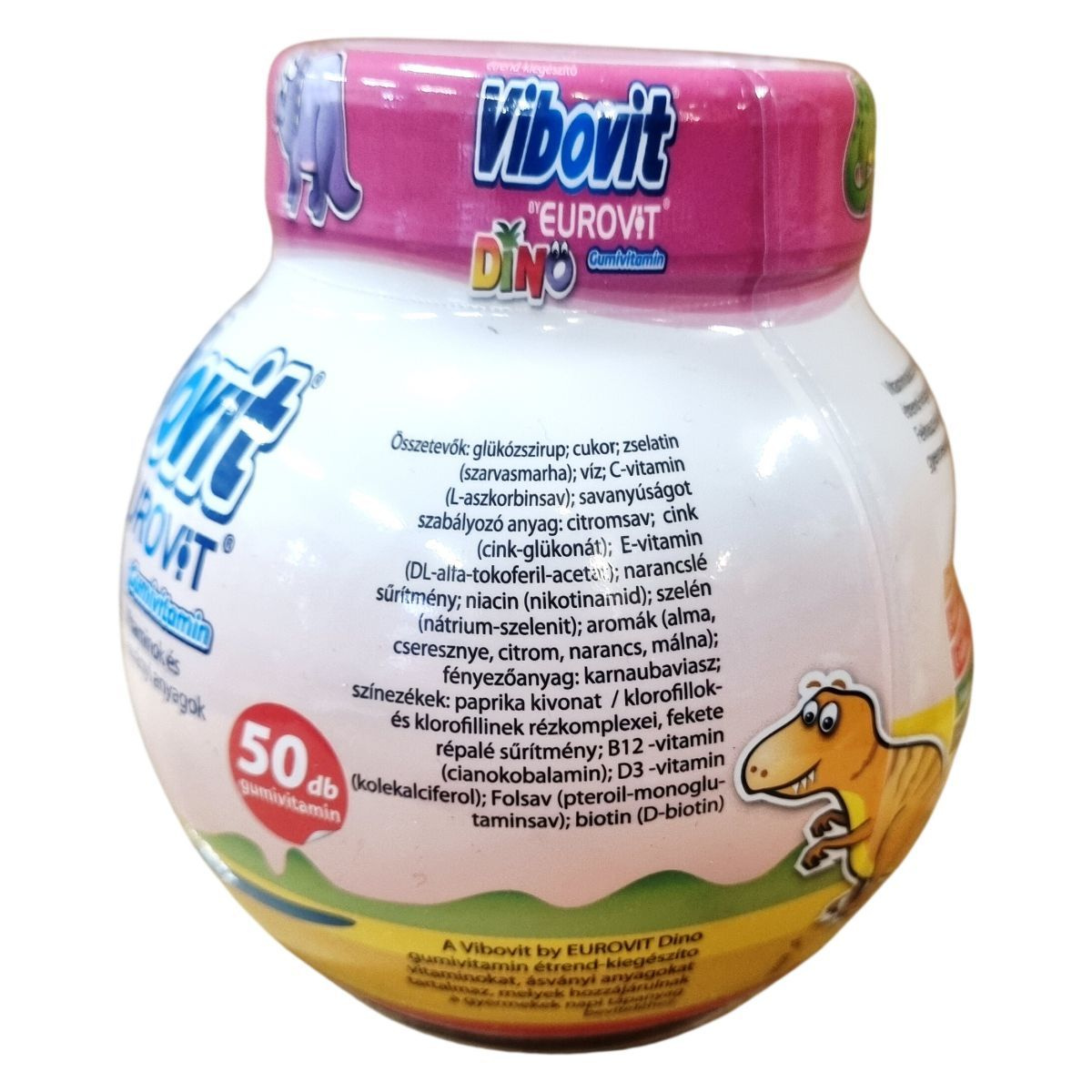A Vibovit by EUROVIT DINO gumivitamin 4 év feletti gyermekek és felnőttek számára készült, alma-, narancs-, citrom- és cseresznye ízesítésben. A termék B3-, B6- és C-vitaminokat tartalmaz, amelyek hozzájárulhatnak a fáradság és a kifáradás csökkentéséhez, valamint cinket, amely segítheti a normál szellemi működés fenntartását. A D-vitamin szerepet játszik a gyermekek csontjainak megfelelő növekedésében és fejlődésében. A gumivitamin egy olyan étrend-kiegészítő, amely vitaminokat és ásványi anyagokat biztosít a szervezet számára, támogatva a mindennapi tápanyagigényt, és segítheti a kiegyensúlyozott táplálkozást. Az EU-ban készült a Teva részére, nettó tömege 200 g (50 db gumivitamin).