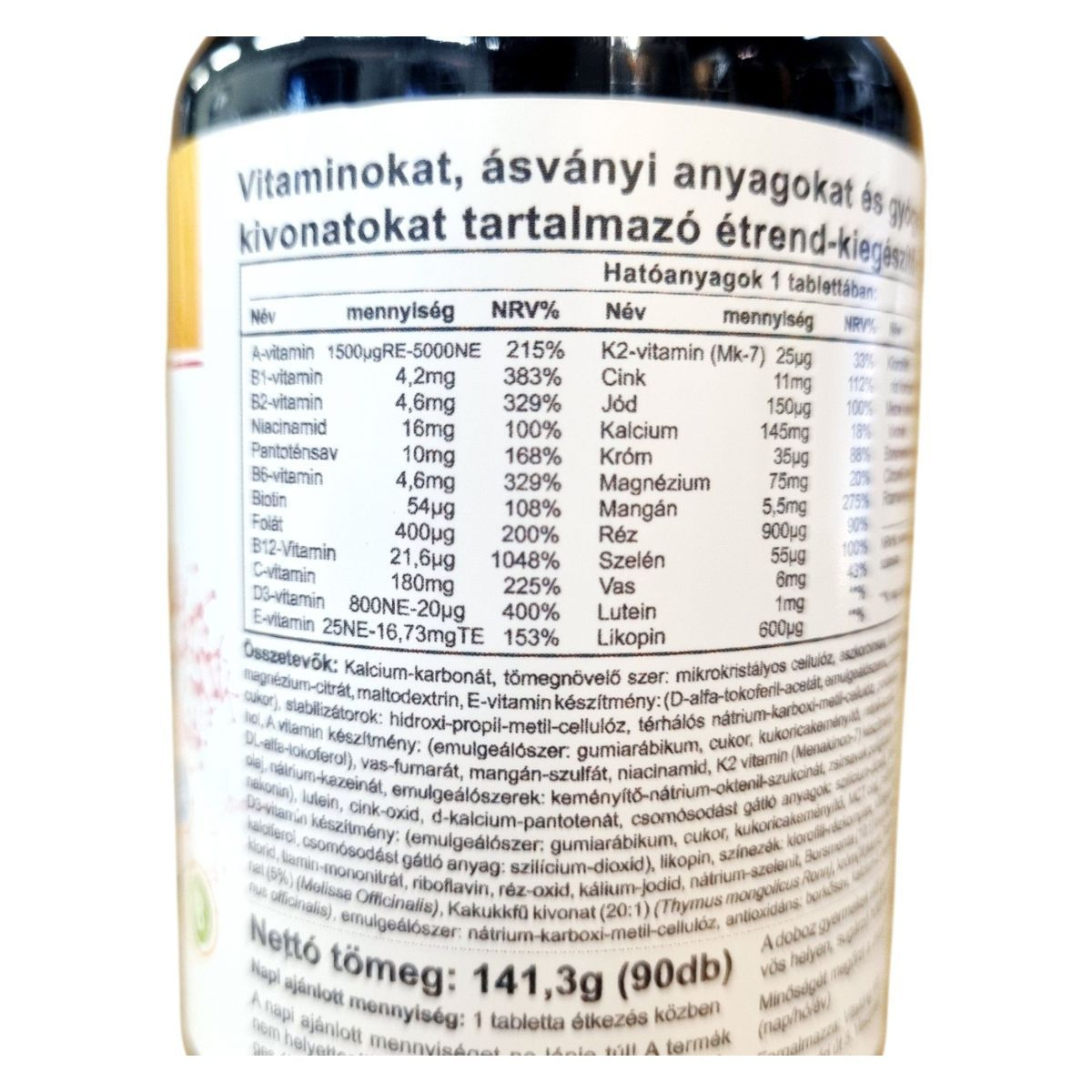 Kalcium-karbonát, mikrokristályos cellulóz, aszkorbinsav, kukoricakeményítő, magnézium-citrát, E-vitamin-készítmény, niacinamid, maltodextrin, polidextróz, gumiarábikum, természetes növényi kivonatok (mezei kakukkfű, borsmenta, citromfű, rozmaring), lutein, likopin.