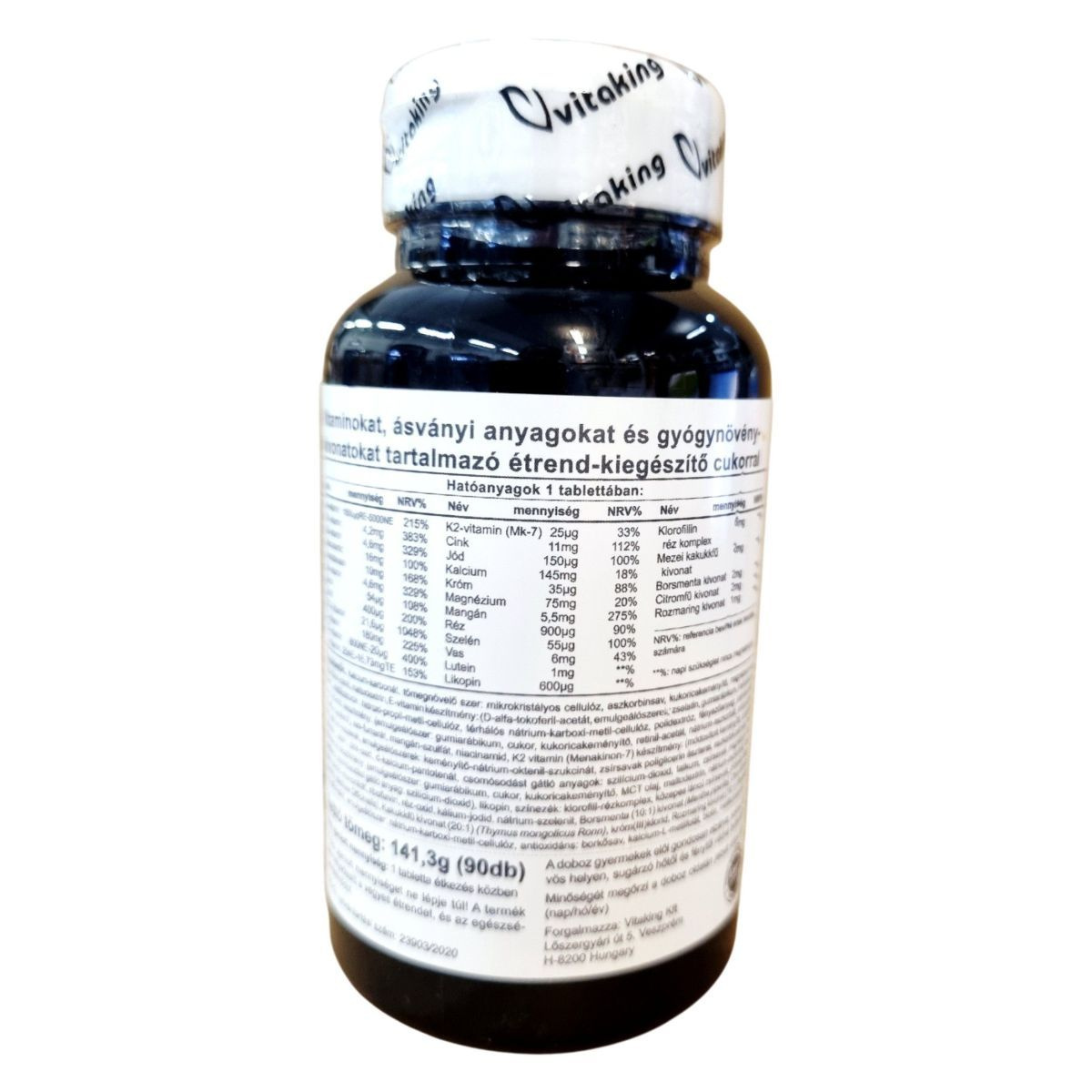 A Vitaking Multivitamin tabletta 28 féle aktív komponenst tartalmaz, köztük esszenciális vitaminokat, ásványi anyagokat és gyógynövény-kivonatokat. A formulát kifejezetten úgy állították össze, hogy támogassa a mindennapi energiát, a szellemi teljesítményt és az immunrendszer optimális működését. A természetes növényi kivonatok – például a mezei kakukkfű, a borsmenta és a citromfű – frissítően egészítik ki a vitamin- és ásványianyag-komplexet. A termék cukrot tartalmaz, de mesterséges színezékektől és GMO-összetevőktől mentes.