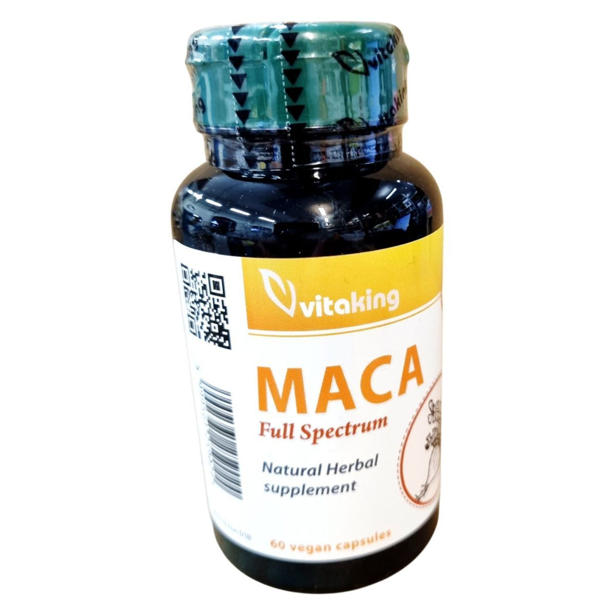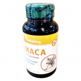 A Vitaking MACA étrend-kiegészítő természetes Maca gyökér port tartalmaz, amelyet a Lepidium meyenii növényből nyernek. A termék 60 vegán kapszulát tartalmaz, és a napi ajánlott mennyiség 3 kapszula. A Maca gyökér hozzájárulhat a vitalitás és az energia támogatásához. A termék összetevői között megtalálható a maltodextrin, a vízmentes dikalcium-foszfát, valamint a hidroxi-propil-metil-cellulóz kapszula. A termék tárolása száraz, hűvös helyen javasolt, gyermekek elől elzárva. A termék OGYÉI engedéllyel rendelkezik, és a Vitaking Kft. forgalmazza.