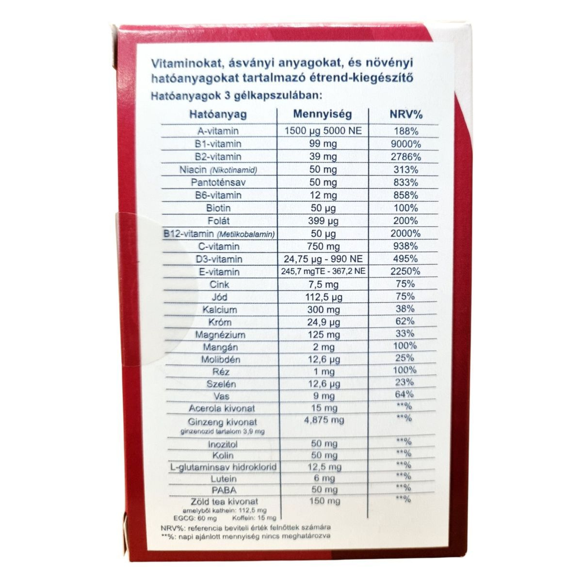 Szójaolaj, kalcium-L-aszkorbát, zselatin kapszulahéj, kalcium-karbonát, glicerin, tisztított víz, D-alfa-tokoferil-acetát, magnézium-oxid, tiamin-mononitrát, zöld tea (Camellia sinensis) levélkivonat, kolin-bitartrát, szilícium-dioxid, lecitin, kalcium-D-pantotenát, cink-glükonát, nikotinamid, vas-fumarát, réz-glükonát, retinil-palmitát, ginzeng (Panax ginseng) gyökérkivonat, kolekalciferol, kalcium-L-metil-folát, nátrium-molibdát, nátrium-szelenit, króm-pikolinát, kálium-jodid, metilkobalamin, D-biotin.