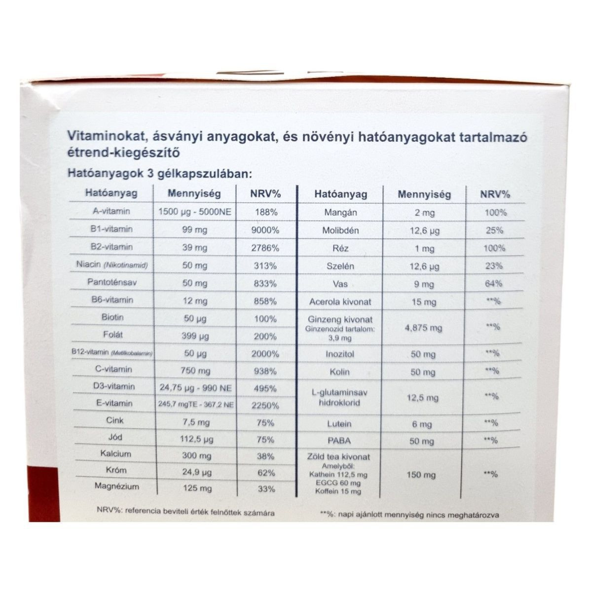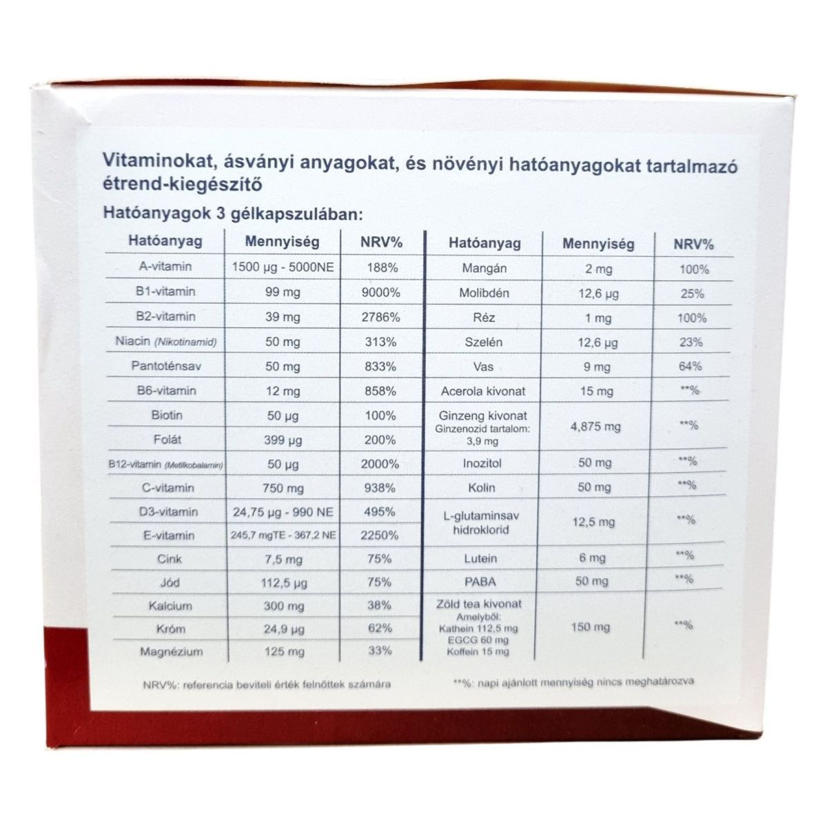 A készítmény több mint húsz vitamint, ásványi anyagot és növényi kivonatot tartalmaz, amelyek együttesen támogathatják a szervezet természetes védekezőképességét, a vitalitást és az energiatermelést. Az A-, B-, C-, D- és E-vitaminok hozzájárulhatnak az immunrendszer, az idegrendszer és az izomfunkció normál működéséhez, míg a lutein, a cink és a biotin segíthetnek a szem és a bőr egészségének megőrzésében. A ginzeng és a zöld tea kivonata antioxidáns és frissítő hatású összetevőket biztosíthat, melyek támogathatják a koncentrációt és a fizikai állóképességet. A termék így komplex módon járulhat hozzá a mindennapi vitalitáshoz és a kiegyensúlyozott életmódhoz.