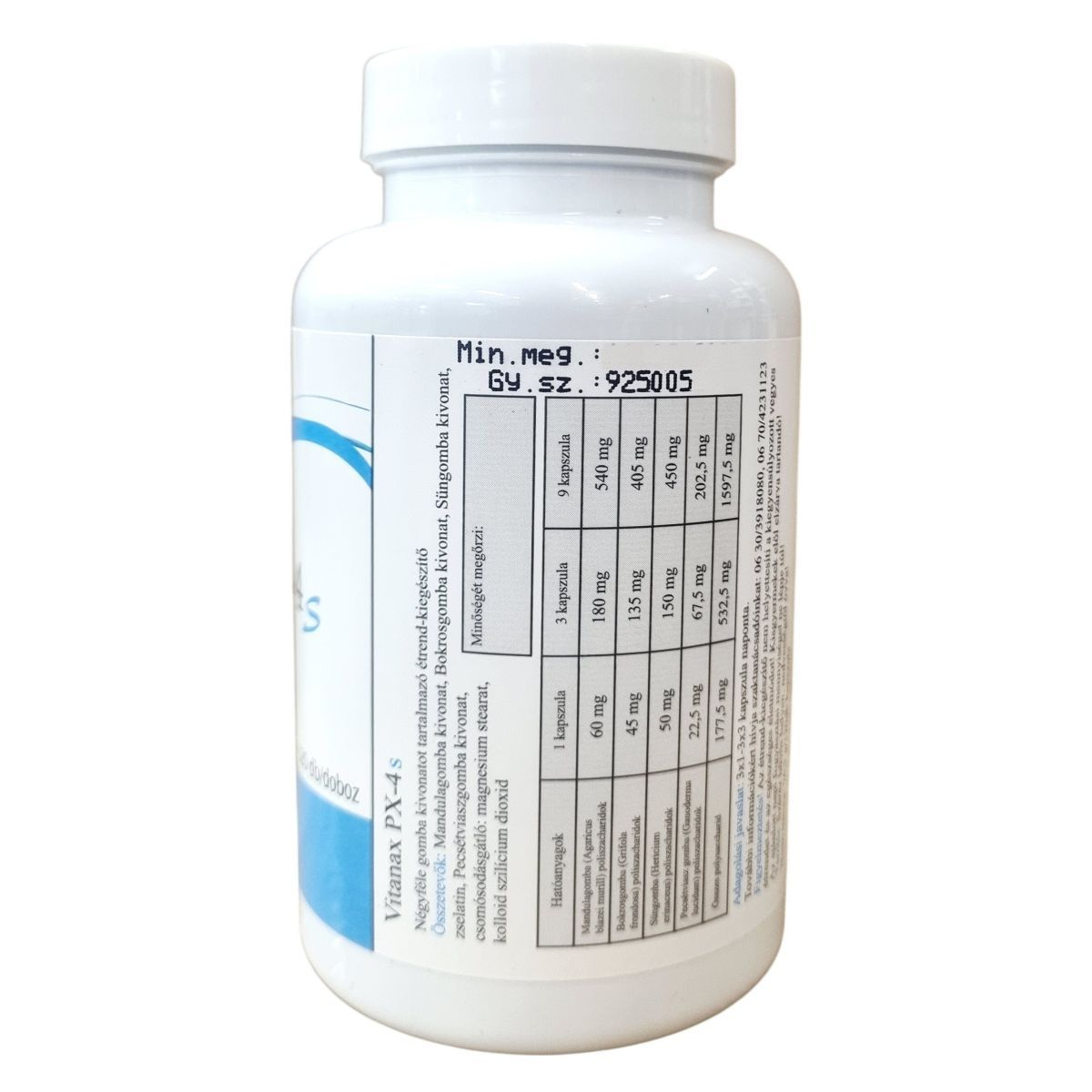 A Vitanax PX-4s étrend-kiegészítő poliszacharidokban gazdag gombakivonatokból készül, többek között mandulagomba (Agaricus blazei murill), bokrosgomba (Grifola frondosa), pecsétviaszgomba (Ganoderma lucidum) és süngomba (Hericium erinaceus) poliszacharidokat tartalmaz. Az ajánlott napi adag 3x1-3x3 kapszula, amely változó mennyiségű hatóanyagot juttat a szervezetbe. Fontos, hogy a termék a kiegyensúlyozott étrendet és az egészséges életmódot nem helyettesíti, kisgyermekektől elzárva kell tartani, valamint az ajánlott mennyiséget sem szabad túllépni. A készítményt száraz, hűvös helyen, nedvességtől védve kell tárolni, és a kapszulák nettó tömege 76,2 gramm, mely 120 darabot tartalmaz egy dobozban.
