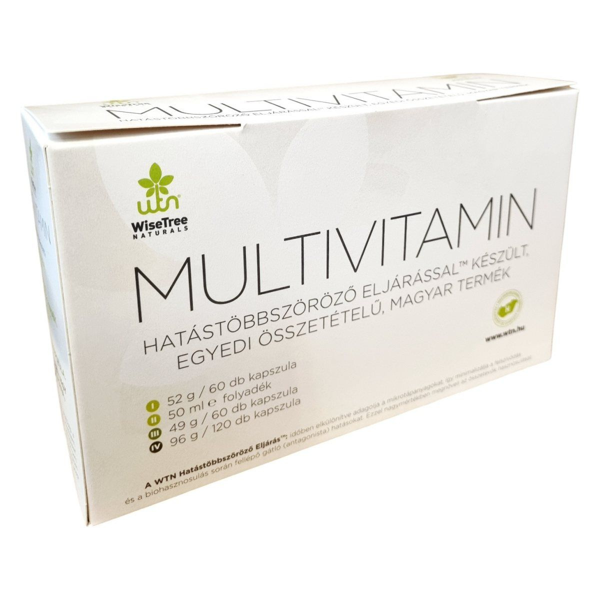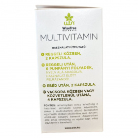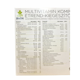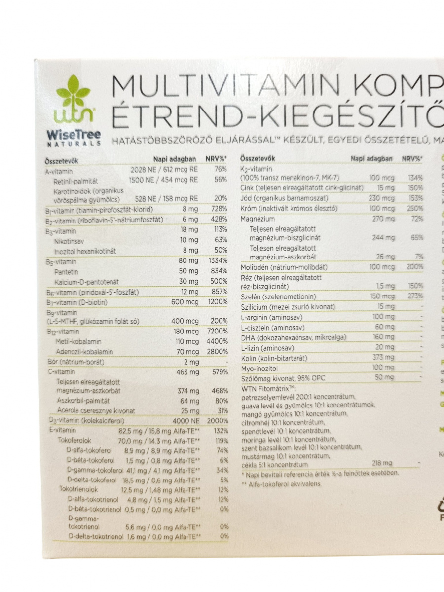 A Wise Tree Naturals Multivitamin Komplex egy egyedülálló, hatástöbbszöröző eljárással™ készült étrend-kiegészítő, amely időben elkülönítve adagolja a mikrotápanyagokat, így minimalizálhatja a felszívódás során fellépő gátló (antagonista) hatásokat. A komplex formula vitaminokat, ásványi anyagokat, nyomelemeket, aminosavakat és növényi kivonatokat tartalmaz, köztük bioaktív formában elérhető B-vitaminokat, természetes C-vitamint és E-vitamin-komplexet, valamint L-arginint, L-ciszteint és L-lizint. A Fitomatrix rendszer különleges növényi koncentrátumai – például guava, spenót, mangó, moringa és bazsalikom kivonat – természetes antioxidánsokat biztosíthatnak. A termék magyar gyártású, prémium minőségű, adalékanyag-mentes, és hozzájárulhat a sejtek oxidatív stresszel szembeni védelméhez, az immunrendszer normál működéséhez és a vitalitás fenntartásához. A csomagolás környezetbarát anyagokból készült, az üveg és műanyag részek szelektív hulladékba helyezendők.