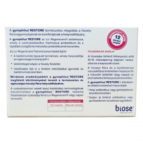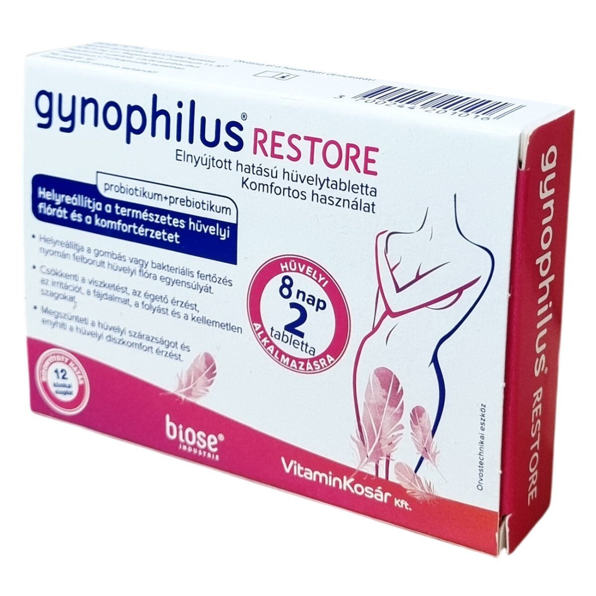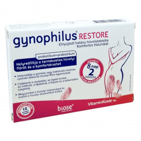 A gynophilus® RESTORE természetes megoldás lehet a hüvelyi flóra egyensúlyának és komfortjának helyreállítására. Az Lcr Regenerans-t tartalmazza, amely a Lacticaseibacillus rhamnosus probiotikumot és természetes prebiotikumokat egyaránt magában foglalja. Hatása háromirányú: tejsavat termel, mely helyreállíthatja a hüvely egészséges pH-értékét; védőréteget képez a hüvely felületén; és segítheti a fertőző mikrobákkal (gombákkal és baktériumokkal) szembeni védelmet. A szabadalommal védett lassú kioldódású technológiának köszönhetően a tabletta négy napig folyamatosan szabadítja fel a hatóanyagot. Használata ajánlott helyi vagy szájon át szedett antibiotikumos vagy gombaellenes kezelés kiegészítőjeként, amely elősegítheti a hüvelyi flóra természetes helyreállítását, valamint csökkentheti a viszketést, égő érzést, irritációt, fájdalmat, folyást és kellemetlen szagokat, továbbá enyhítheti a hüvelyi szárazságot és diszkomfort érzést.