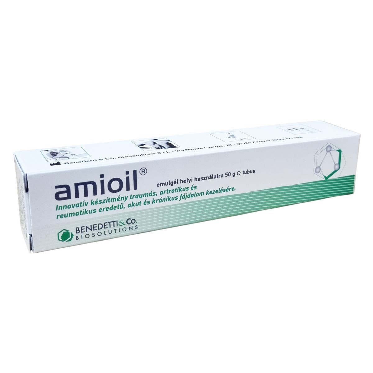 Az amioil® emulgél egy innovatív készítmény, mely helyi használatra készült a traumás, artrotikus és reumatikus eredetű fájdalmak kezelésére, legyenek azok akutak vagy krónikusak. Formulája olyan gyógynövényi és hatóanyagokat tartalmaz, melyek támogatják a gyulladáscsökkentést és a fájdalomcsillapítást. Az Ozolipoile® komponens olajsavban stabilizált ózont, alfa-liponsavat és E-vitamin acetátot foglal magában, miközben a hegyi árnika, ördögkarom és fekete ribizli kivonatokkal többirányú támogatást biztosít. Ezenkívül a bromelain, panthenol, mentol, glükózamin és hidrolizált glükózaminoglikánok segítik a bőr regenerálódását és a fájdalom enyhítését. A termék használható ultrahangos vagy elektroforézises kezelésekkel kombinálva is, tovább növelve hatékonyságát. A készítményt mindig zárt állapotban, a használati útmutató szerint kell tárolni, és gyermekektől elzárva kell tartani.