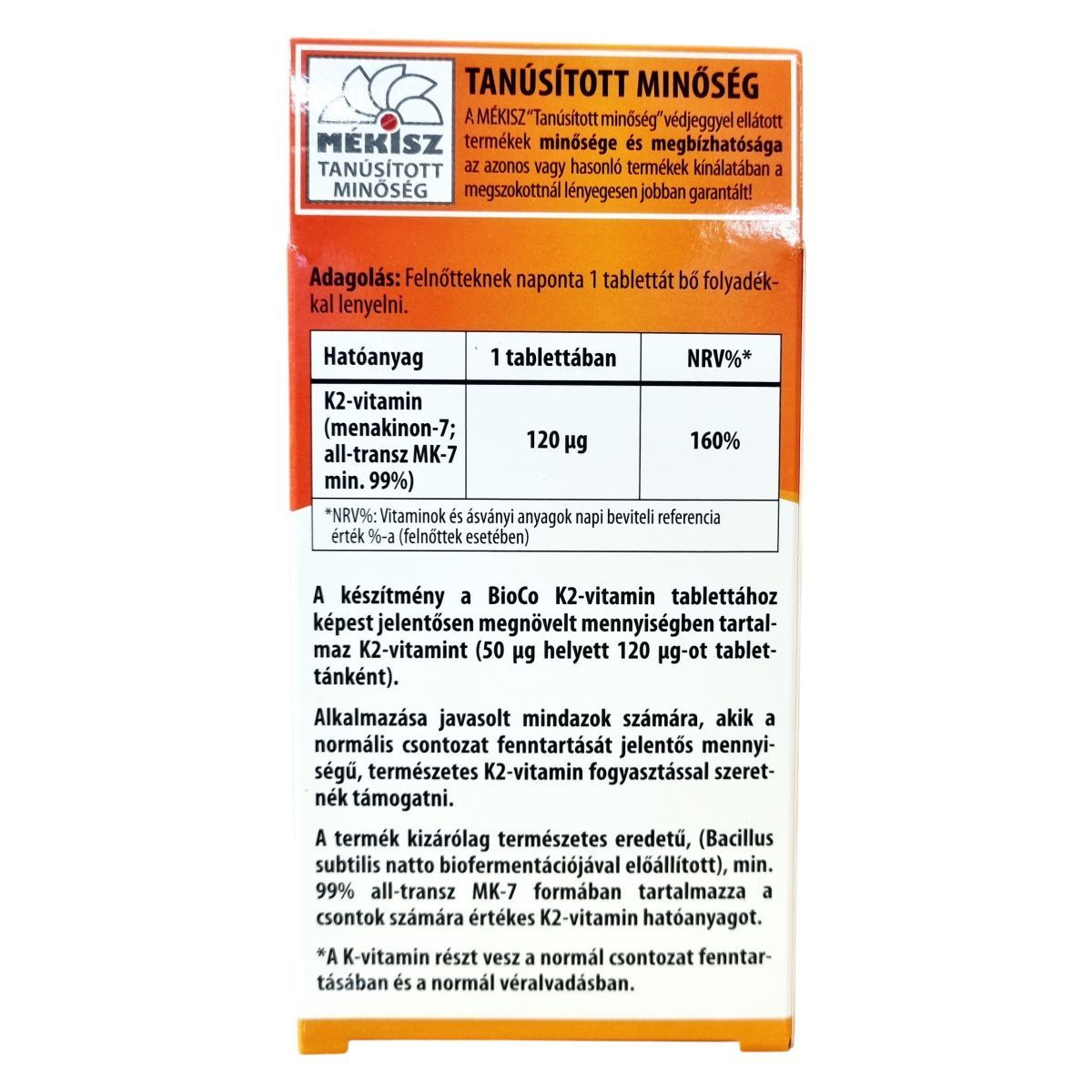 A készítmény a BioCo K2-vitamin tablettához képest megnövelt mennyiségben tartalmaz K2-vitamint (50µg helyett 120µg-ot tablettánként).