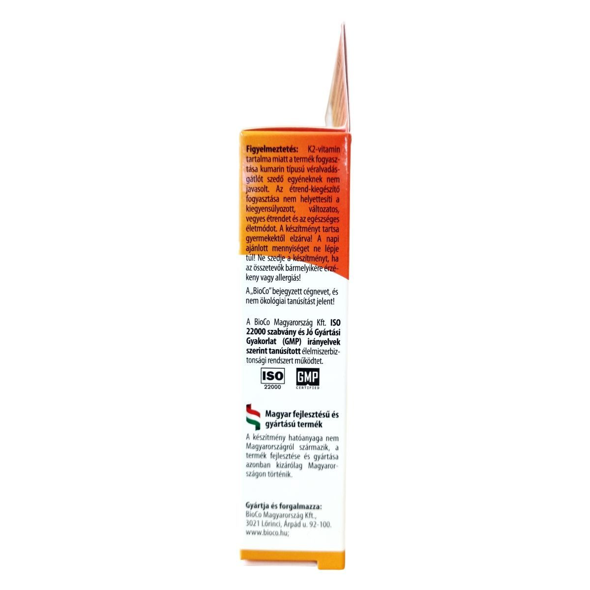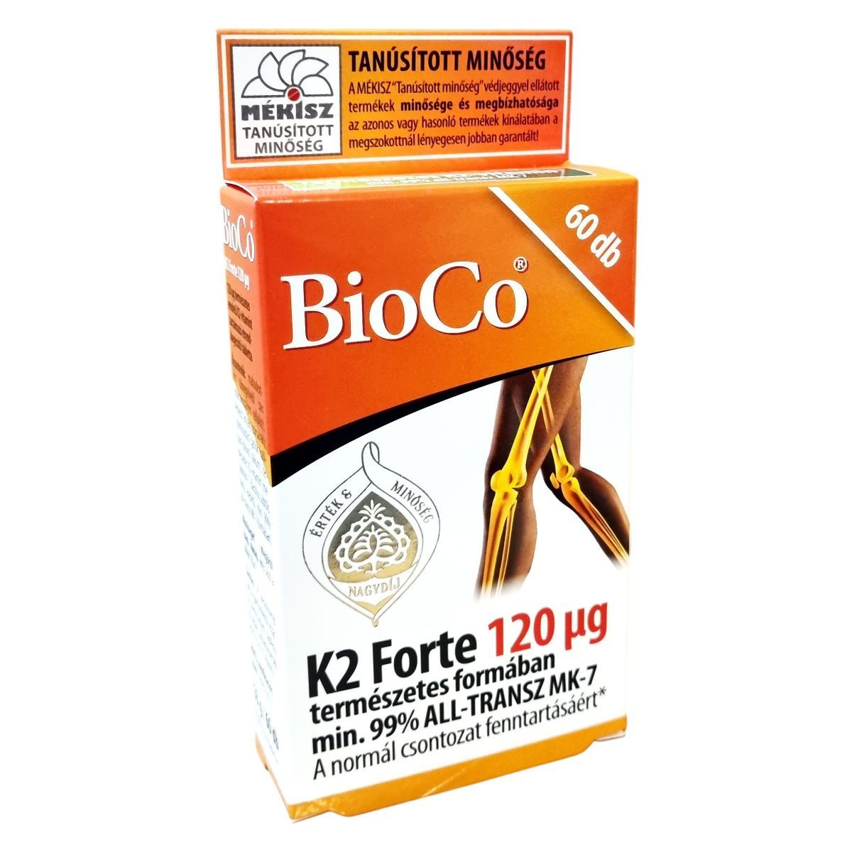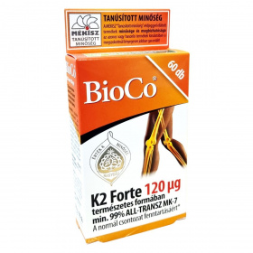A BioCo K2 Forte tabletta a normál csontozat fenntartásához szükséges K2-vitamint természetes eredetű formában, a Bacillus subtilis natto biofermentációjával előállított min. 99% all-transz MK-7 hatóanyagként tartalmazza. A készítmény hatóanyaga nem Magyarországról származik, azonban a termék fejlesztése és gyártása kizárólag Magyarországon történik. A BioCo Magyarország Kft. ISO 22000 szabvány és Jó Gyártási Gyakorlat (GMP) irányelvek szerint tanúsított élelmiszerbiztonsági rendszert működtet. A termék a BioCo K2-vitamin tablettához képest jelentősen megemelt K2-vitamin mennyiséget tartalmaz tablettánként, így ajánlott mindazok számára, akik természetes K2-vitamin fogyasztással támogatnák a csontok egészségét. A „BioCo” bejegyzett cégnevet jelenti, nem ökológiai tanúsítást. A termék a MÉKISZ "Tanúsított minőség" védjeggyel ellátott, amely a termék megbízhatóságát és minőségét garantálja a piacon.
