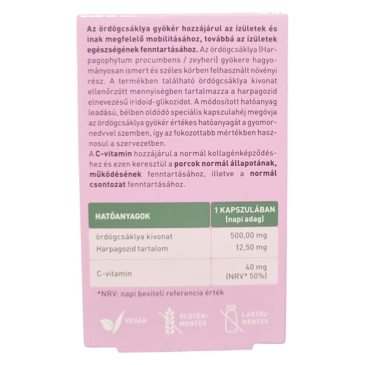 Az ördögcsáklya gyökere hozzájárulhat az ízületek és inak megfelelő mobilitásához, illetve az ízületek egészségének fenntartásához. A termékben található ördögcsáklya kivonat ellenőrzött mennyiségben tartalmazza a harpagozid elnevezésű iridoid-glikozidot. A speciális, bélben oldódó kapszulahéj megóvja az ördögcsáklya gyökér értékes hatóanyagát a gyomornedvvel szemben, ezáltal a hatóanyag jobban hasznosulhat a szervezetben. A C-vitamin hozzájárulhat a normál kollagénképződéshez, ezen keresztül a porcok normál állapotának és működésének, valamint a normál csontozat fenntartásához. A termék vegán, glutén- és laktózmentes, és hidroxi-propil-metil-cellulóz alapú növényi kapszulahéjjal készül. Kúraszerű alkalmazása javasolt a megfelelő hatás elérése érdekében.