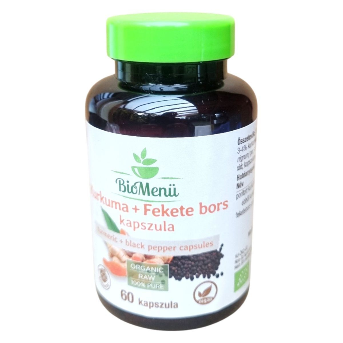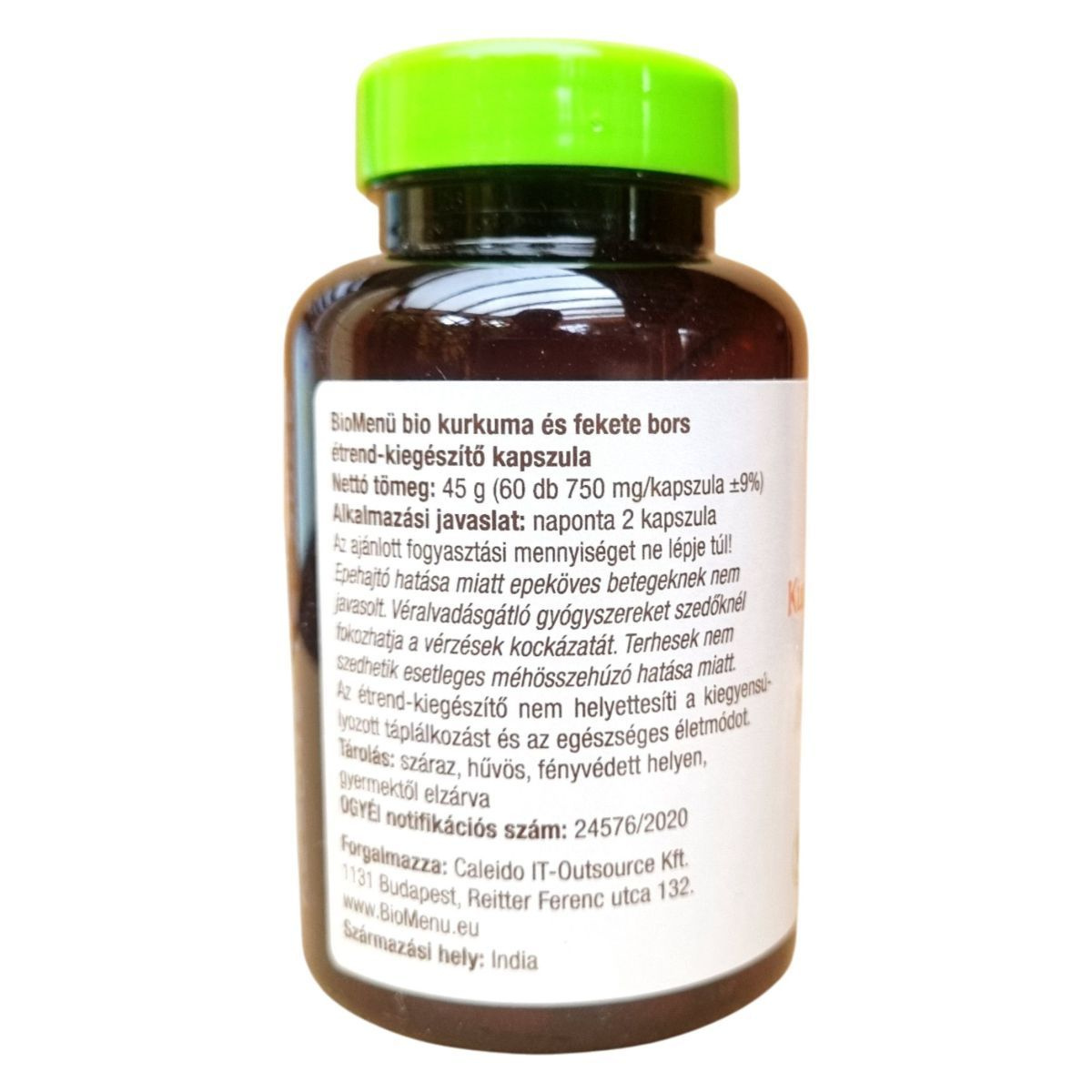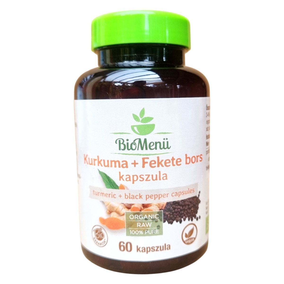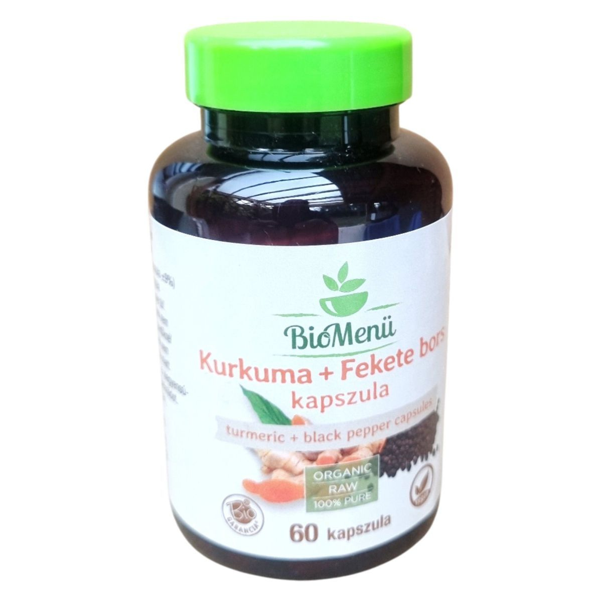 A BioMenü Kurkuma + Fekete bors kapszula egy bio, raw és vegán étrend-kiegészítő, amely 100% tiszta kurkuma és fekete bors porból készül. A termék 60 kapszulát tartalmaz, melyek napi adagja 2 kapszula. A kurkuma kurkumintartalma 3-4%, és a fekete bors segíthet a kurkumin felszívódásában. A termék nem javasolt epekőves betegeknek és terheseknek. Tárolása száraz, hűvös, fényvédett helyen ajánlott. A termék OGYÉI notifikációs számmal rendelkezik, és a Caleido IT-Outsource Kft. forgalmazza.