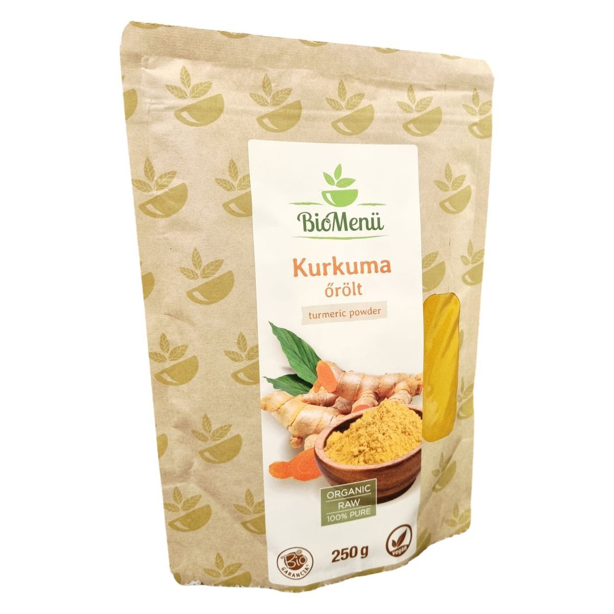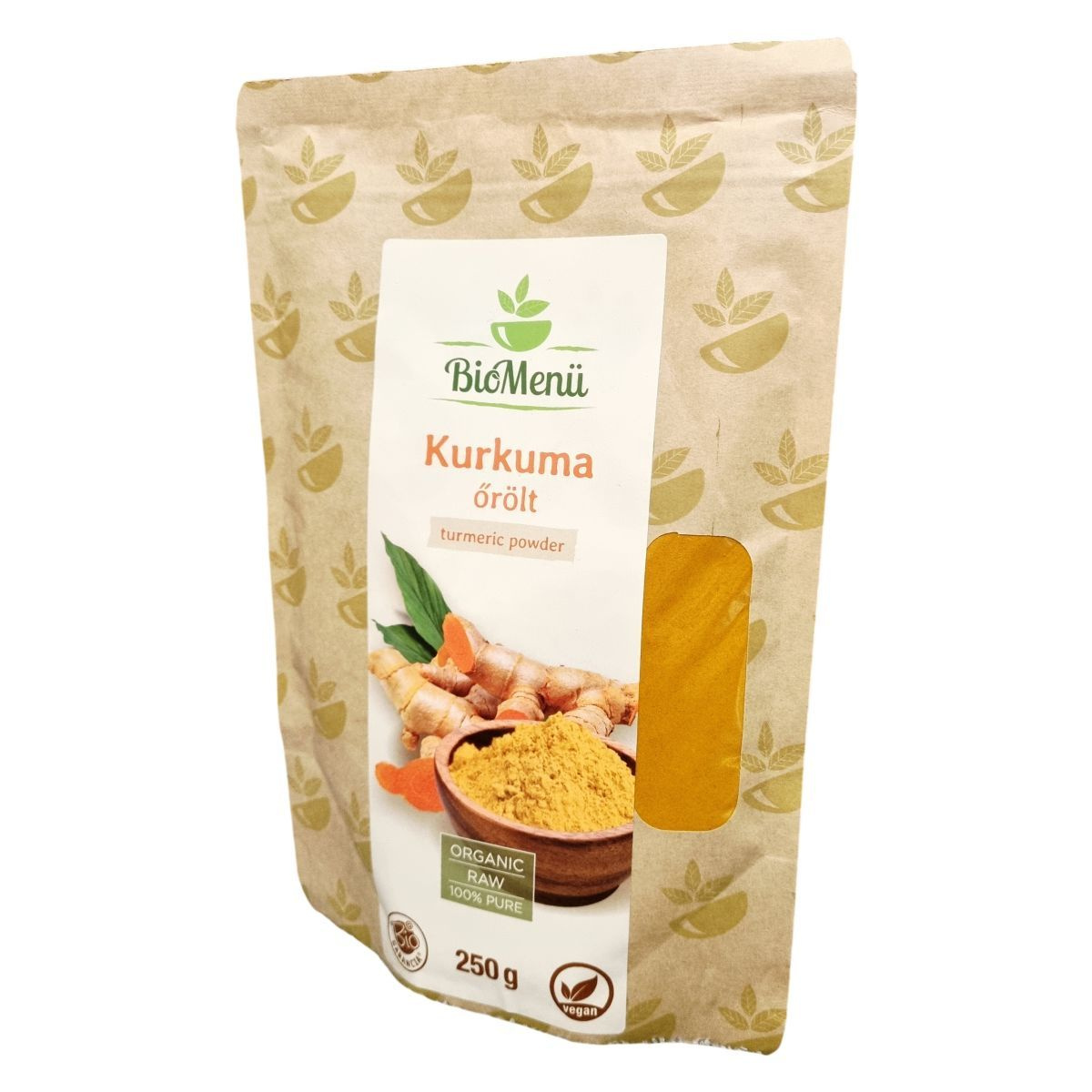 A BioMenü BIO Kurkuma őrölt termék nettó tömege 250 gramm, és Indiából származik. Az összetétel 100% bio kurkuma (curcuma longa), amely 3-4% kurkumin tartalmat tartalmaz. A termék egy organikus, natúr fűszer, amely raw és vegán étrendbe is beilleszthető. A csomagolás egyben 50 adagnyi adagot biztosít, amelyek ízlés szerint adagolhatók. A csomagoláson jelölt kódok és garanciák kiszámíthatóságot és minőséget biztosítanak a vásárlók számára. Az EU-n kívüli mezőgazdasági termékek közé tartozik, és a HU-ÖKO-02 tanúsítvány igazolja bio minőségét.