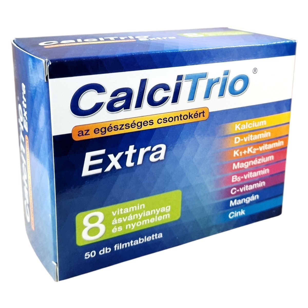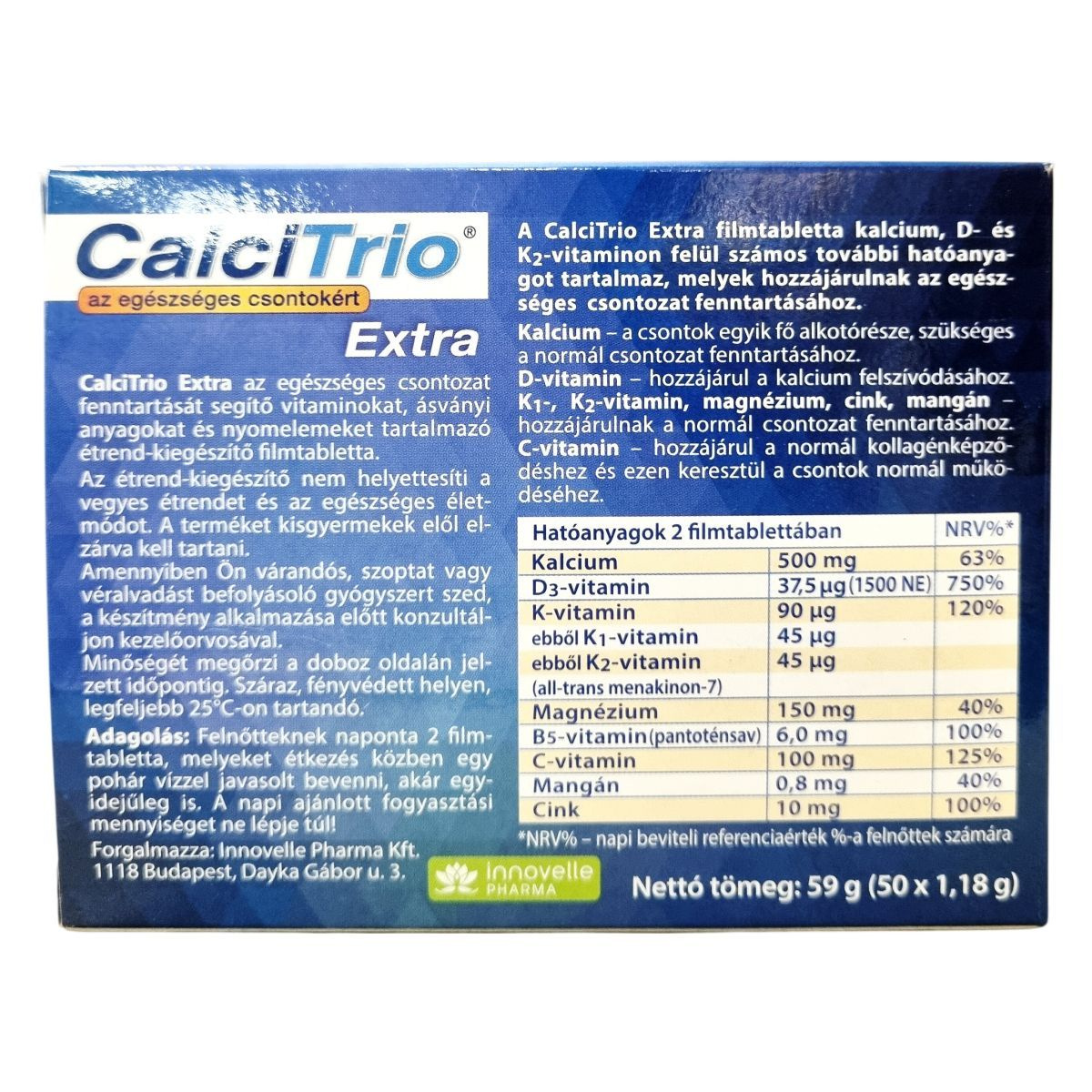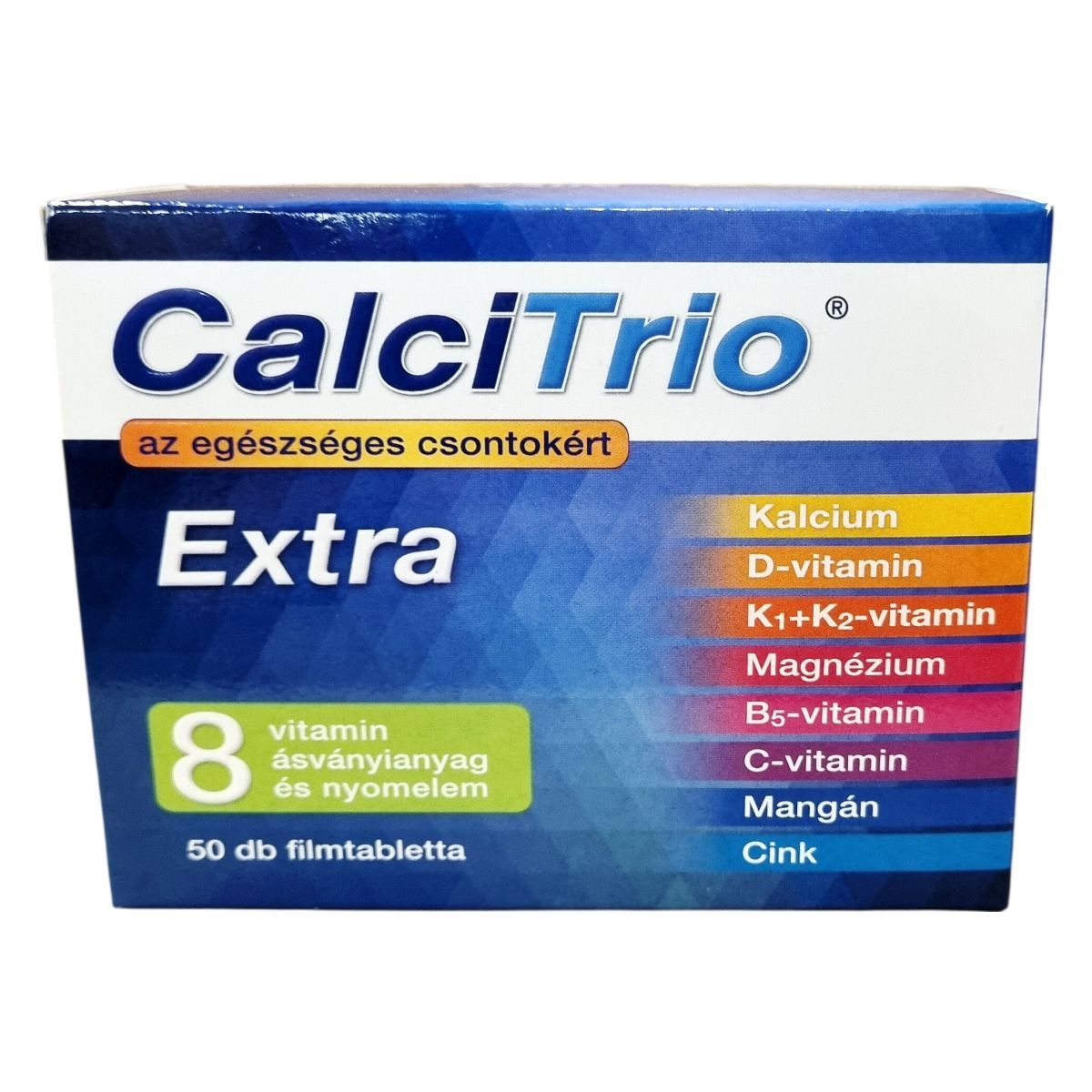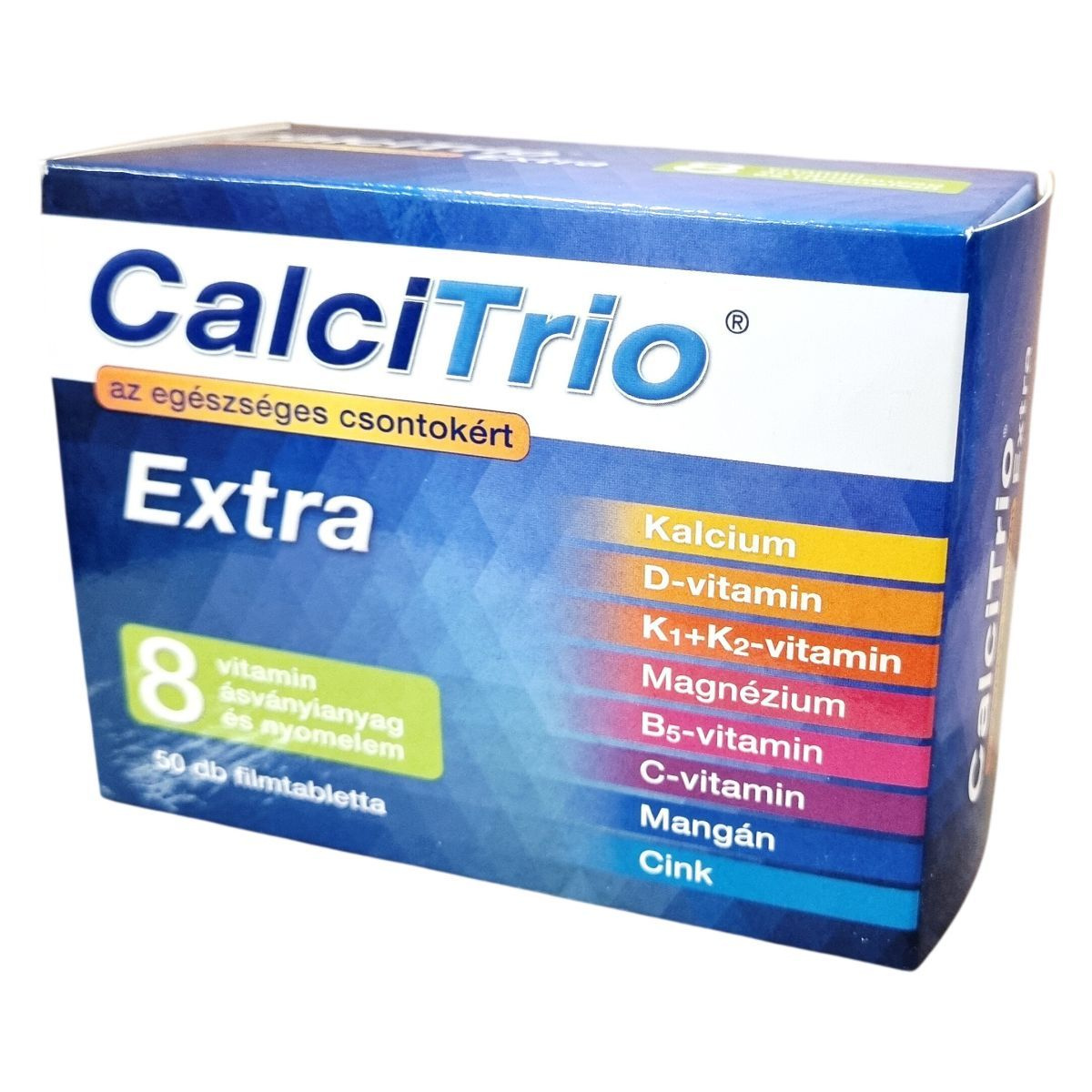 A CalciTrio Extra olyan filmtabletta, amely kalciumot, D- és K2-vitamint, valamint további vitaminokat, ásványi anyagokat és nyomelemeket tartalmaz az egészséges csontozat fenntartásához. A kalcium a csontok egyik fő alkotórésze, amely szükséges a normál csontozat fenntartásához. A D-vitamin a kalcium felszívódását segítheti elő. A K1- és K2-vitamin, a magnézium, a cink és a mangán mind hozzájárulhat a normál csontozat fenntartásához. A C-vitamin támogatja a normál kollagénképződést, amely a csontok működésében lehet fontos szerepű. A termék 50 darab filmtablettát tartalmaz, nettó tömege 59 gramm. Az elsődleges összetevő, a kalcium-karbonát Németországból származik, míg a termék Magyarországon készül.