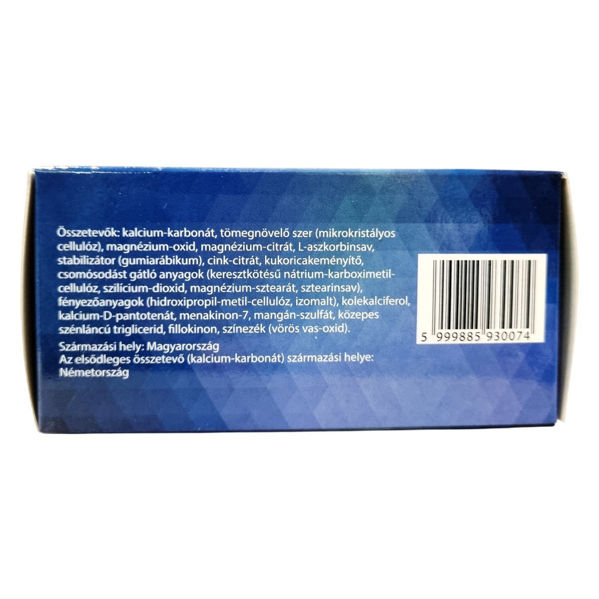 kalcium-karbonát, mikrokristályos cellulóz, magnézium-oxid, magnézium-citrát, L-aszkorbinsav, gumiarábikum, cink-citrát, kukoricakeményítő, keresztkötésű nátrium-karboximetil-cellulóz, szilícium-dioxid, magnézium-sztearát, sztearinsav, hidroxipropil-metil-cellulóz, izomalt, kolekalciferol, kalcium-D-pantotenát, menakinon-7, mangán-szulfát, közepes szénláncú triglicerid, fillokinon, vörös vas-oxid