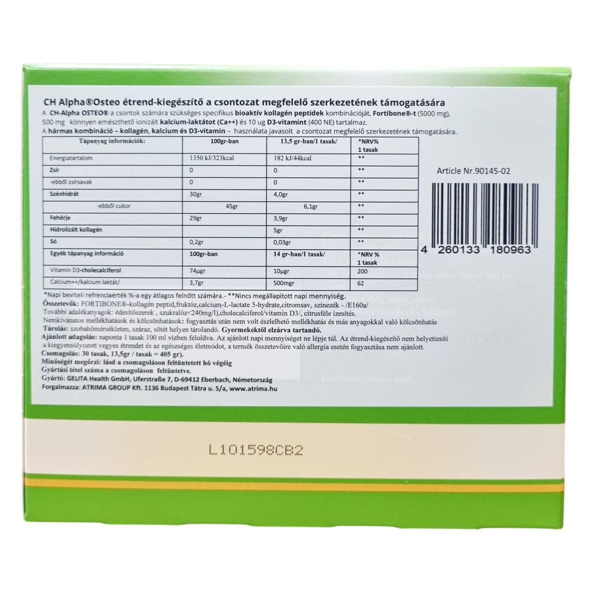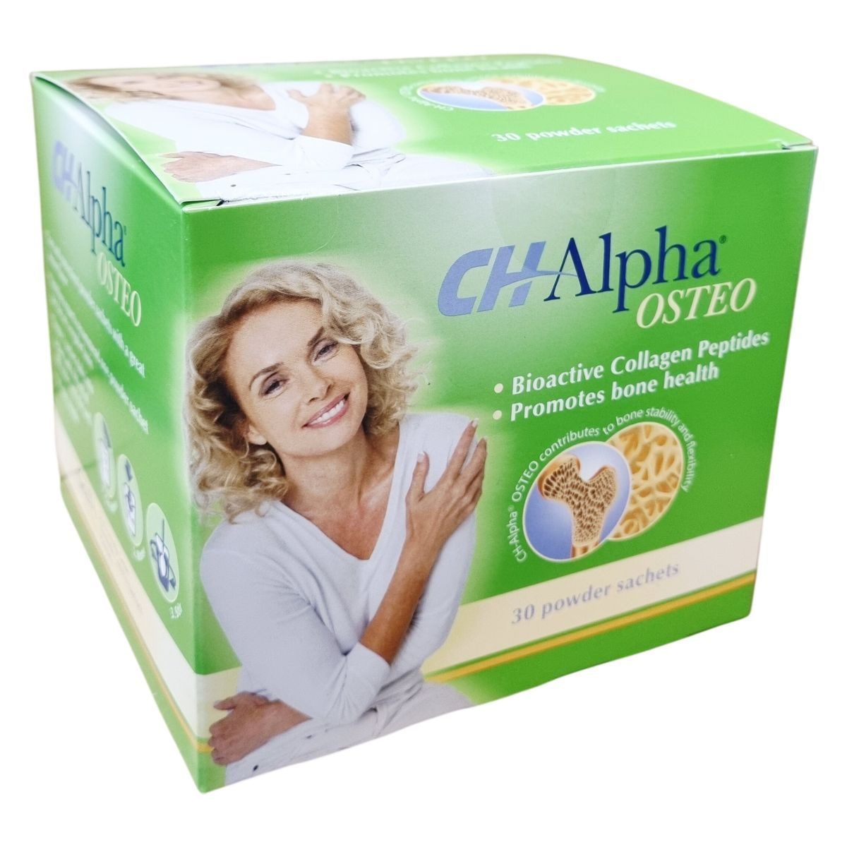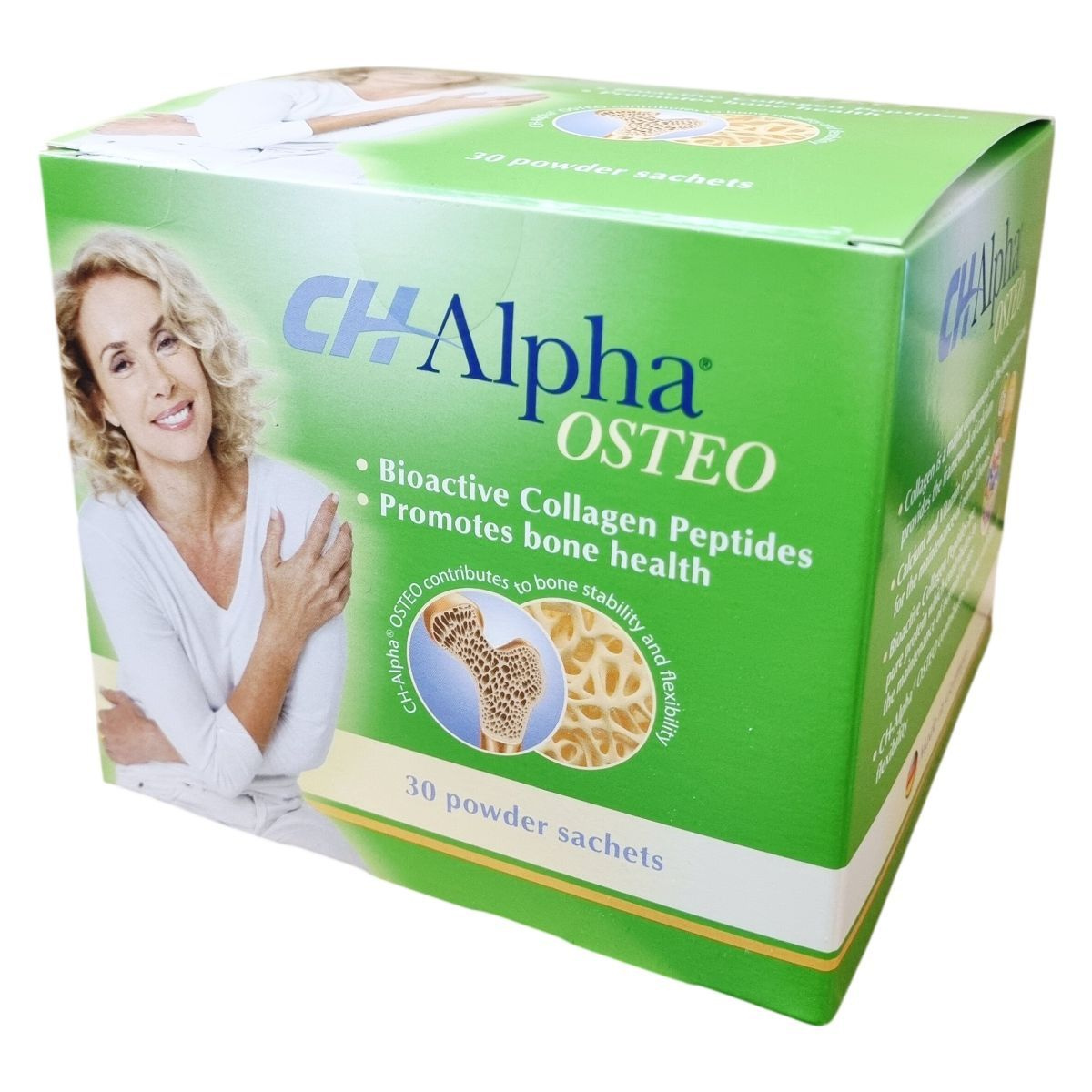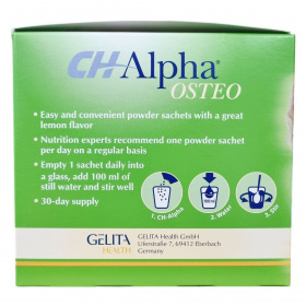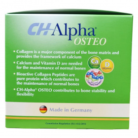 A CH Alpha OSTEO egy étrend-kiegészítő, amely a csontozat megfelelő szerkezetének támogatására készült. A termék speciális bioaktív kollagén peptideket, ionizált kalcium-laktátot és D3-vitamint tartalmaz, ami hozzájárulhat a csontok stabilitásához és rugalmasságához. A kollagén a csontok mátrixának fő összetevője, amely kalcium háttérként szolgál, míg a kalcium és a D-vitamin a normál csontok fenntartásához szükségesek. A termék por alakban, kellemes citrom ízű tasakokban kapható, megkönnyítve a napi egyszeri adagolást. Az étrend-kiegészítő Németországban készül, és nem észleltek ellene nemkívánatos mellékhatásokat vagy kölcsönhatásokat.