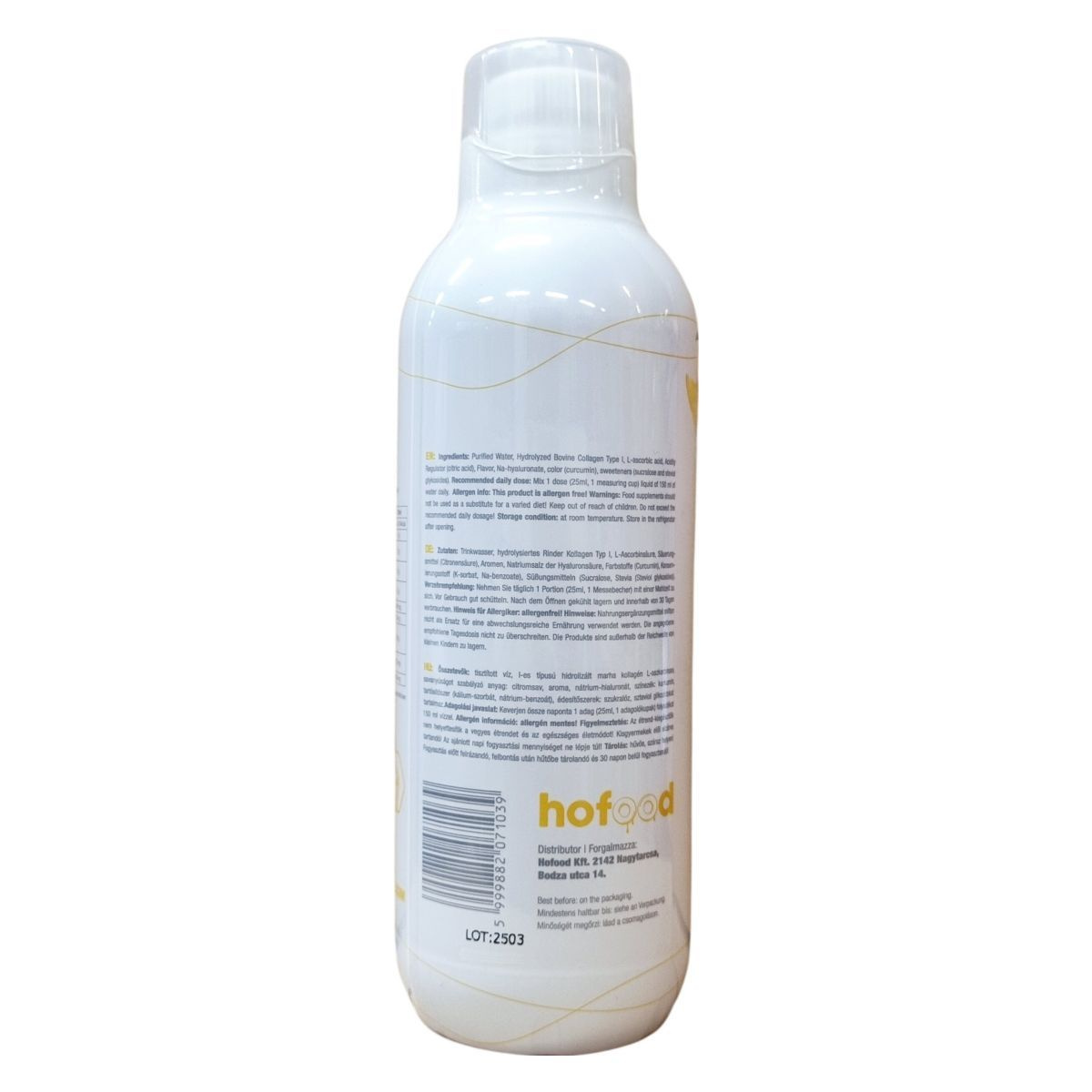A COLLANGO COLLAGEN LIQUID egy folyékony étrend-kiegészítő, amely tisztított vizet, 1-es típusú hidrolizált marha kollagént, L-aszkorbinsavat, citromsavat, aromát, nátrium-sóját a hialuronsavnak, kurkuminnal színezett, valamint szukralózt és szteviol-glikozidokat tartalmaz édesítőként. A termék sárgadinnye és mangó ízesítésű. Az adagolás során javasolt a folyékony koncentrátumot 150 ml vízzel összekeverve fogyasztani. A készítmény allergénmentes és nem helyettesíti a változatos étrendet és egészséges életmódot. Gyermekektől elzárva kell tárolni, és az ajánlott napi adagolást nem szabad túllépni. A csomagot szobahőmérsékleten célszerű tartani, felbontás után azonban hűtőszekrényben, és 30 napon belül fogyasztandó el.