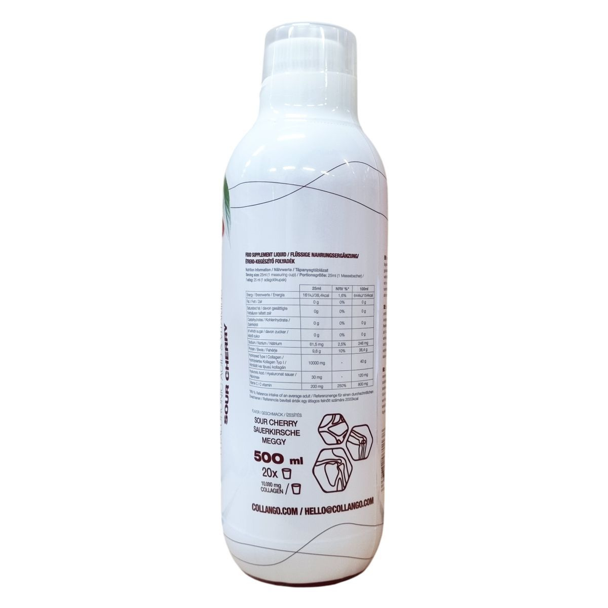 A Collango Collagen Liquid egy folyékony étrend-kiegészítő, amely I-es típusú hidrolizált marha kollagént, hyaluronsavat és C-vitamint tartalmaz meggy ízesítéssel. Az adagolás naponta 25 ml, amit ajánlott 150 ml vízzel elkeverni. Az összetevők között megtalálható a tisztított víz, citromsav, aroma, valamint természetes és mesterséges édesítőszerek, mint a szukralóz és a szteviol glikozidok. A termék allergénmentes, nem helyettesíti a változatos étrendet, és nem haladható meg a javasolt adag. A megadott tápértékek alapján magas fehérjetartalommal rendelkezik, kiemelve a kollagén és a C-vitamin mennyiségét. A készítményt szobahőmérsékleten kell tárolni, azonban felbontás után hűtőben és 30 napon belül ajánlott elfogyasztani. A termék kiszerelése 500 ml, ami 20 adag folyadékot jelent meggy ízben.