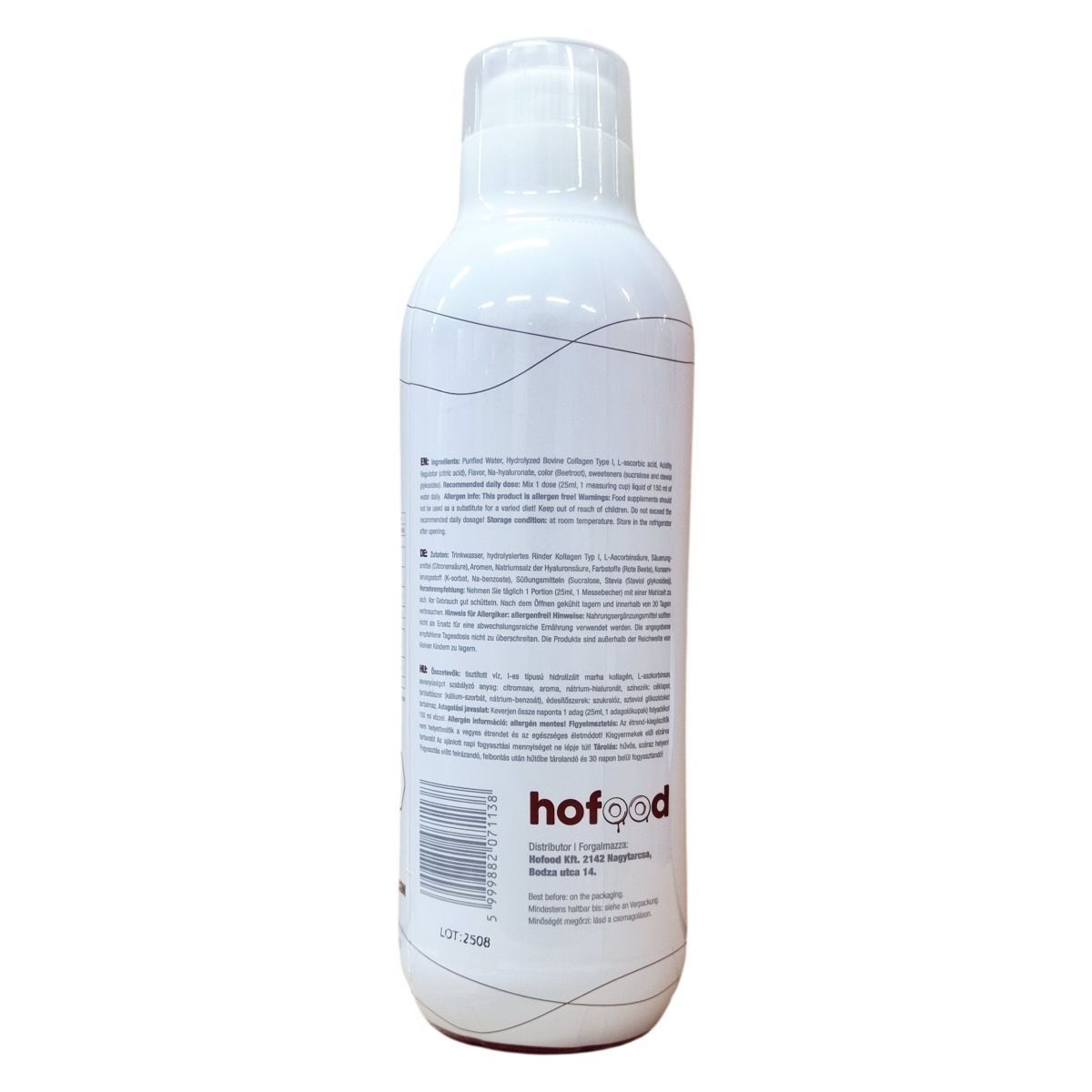 tisztított víz, I-es típusú hidrolizált marha kollagén, L-aszkorbinsav, citromsav, aroma, nátrium-hialuronát, cékla (színezék), kálium-szorbát, nátrium-benzoát, szukralóz, szteviol glikozidok