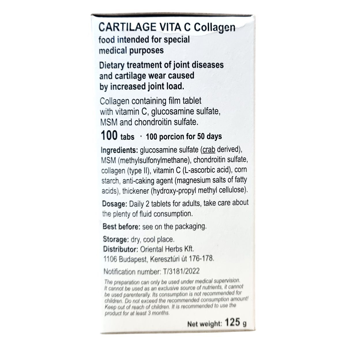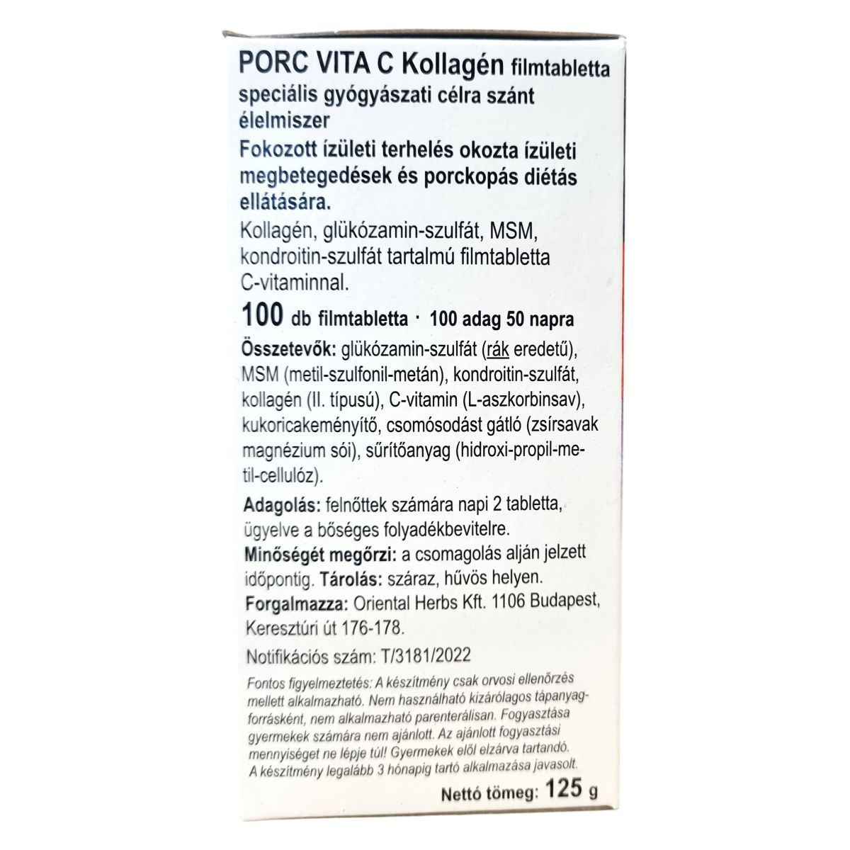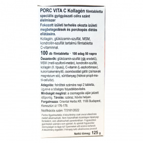 A Porc Vita C kollagén filmtabletta speciális gyógyászati célra szánt élelmiszer, amelyet ízületi megbetegedések és porckopás diétás ellátására fejlesztettek ki. A készítmény kollagént (II. típusú), glükózamin-szulfátot, metil-szulfonil-metánt (MSM), kondroitin-szulfátot és C-vitamint tartalmaz. A termék 100 db filmtablettát tartalmaz, ami 100 adagnak felel meg, 50 napos használatra. Az aktív összetevők támogatására szolgálhatnak a fokozott ízületi terhelés esetén kialakuló problémák kezelésében. A termék a helyes gyártási gyakorlat szerint készül, és minőségi előírásoknak megfelelően ellenőrzött. A készítményt csak orvosi felügyelet mellett szabad alkalmazni, kizárólagos tápanyagforrásként nem használható, és parenterálisan nem alkalmazható. Gyermekek számára nem ajánlott, és az ajánlott napi mennyiséget nem szabad túllépni. A termék legalább három hónapos folyamatos alkalmazása javasolt a legjobb eredmény érdekében.