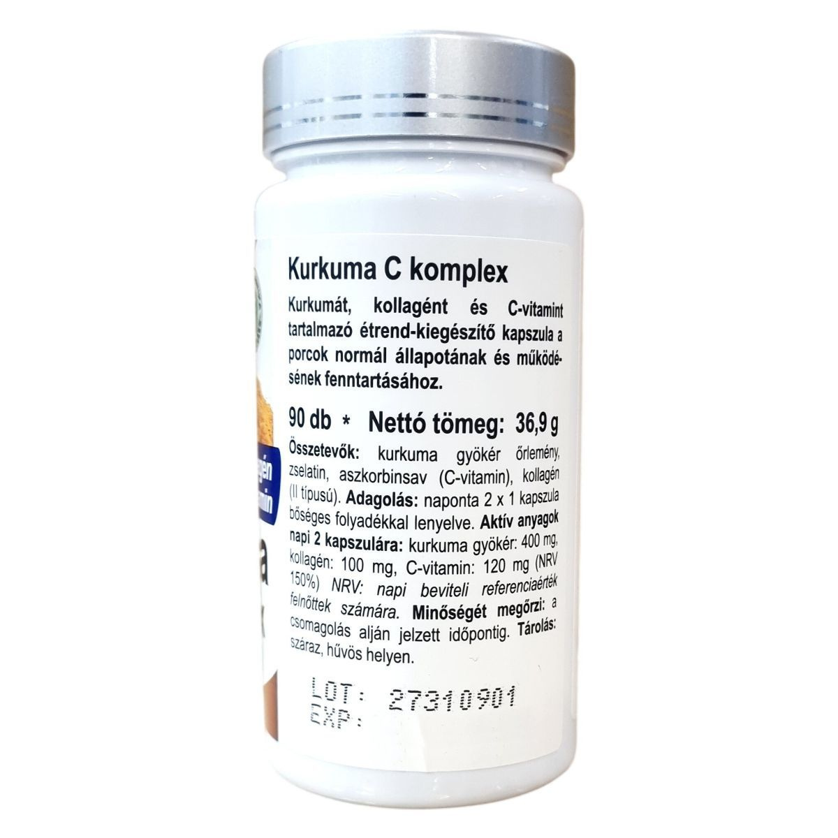 A Kurkuma C komplex egy étrend-kiegészítő kapszula, amely kurkuma gyökér őrleményt, II. típusú kollagént és C-vitamint tartalmaz. Ezek az összetevők hozzájárulhatnak a porcok normál állapotának és működésének fenntartásához. A C-vitamin elősegítheti a kollagénképződést, amely elengedhetetlen a porcok egészségéhez. A termék 90 kapszulát tartalmaz, nettó tömege 36,9 gramm. A készítmény használatakor fontos az ajánlott napi adag betartása és a bőséges folyadék fogyasztása. Figyelembe kell vennie az epekővel rendelkezők, várandós és szoptató nők, valamint véralvadásgátló szert szedők számára vonatkozó ellenjavallatokat. A termék gyártója és forgalmazója az Oriental Herbs Kft., a csomagoláson feltüntetett minőségmegőrzési időpontig ajánlott a fogyasztásra.