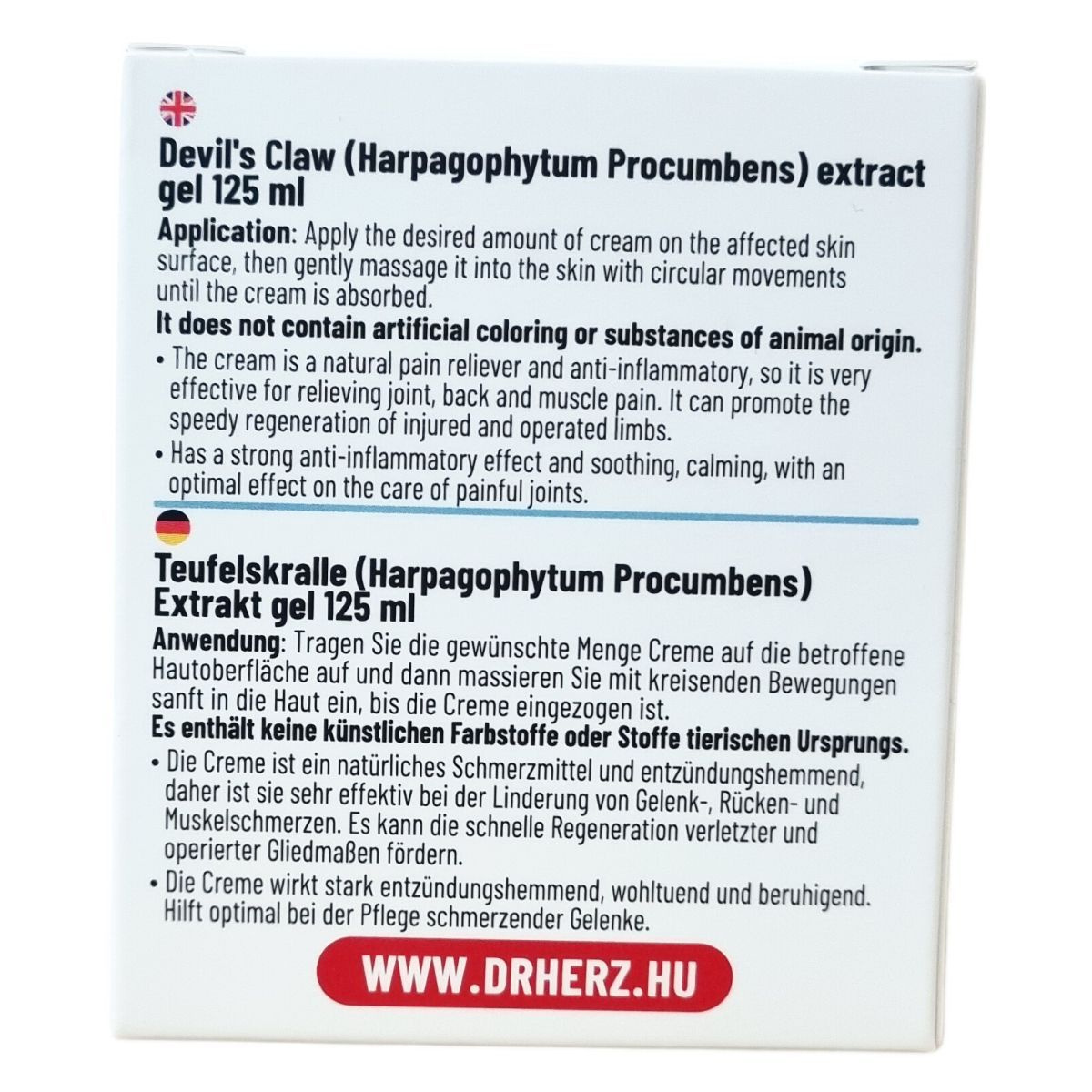 Az Ördögkarom (Harpagophytum Procumbens) kivonatot tartalmazó gél természetes eredetű, mesterséges színezéket és állati eredetű anyagokat nem tartalmaz. Természetes fájdalomcsillapító és gyulladáscsökkentő tulajdonságokkal rendelkezik, így különösen hatékony ízületi, derék- és izomfájdalmak enyhítésére. Segítheti a sérült vagy műtött végtagok gyorsabb regenerálódását. A krém hatása gyulladáscsökkentő, nyugtató és bőrnyugtató, optimálisan támogatja a fájdalmas ízületek ápolását. A termék ajánlott továbbá immunerősítésre, méregtelenítésre, anyagcsere támogatására, valamint a bőr, haj és köröm ápolására. Kizárólag gyógyszertárakban és gyógynövényboltokban kapható, német minőségben készül, és folyamatosan biztosítja az optimális bőrápolást és fájdalomcsillapítást.