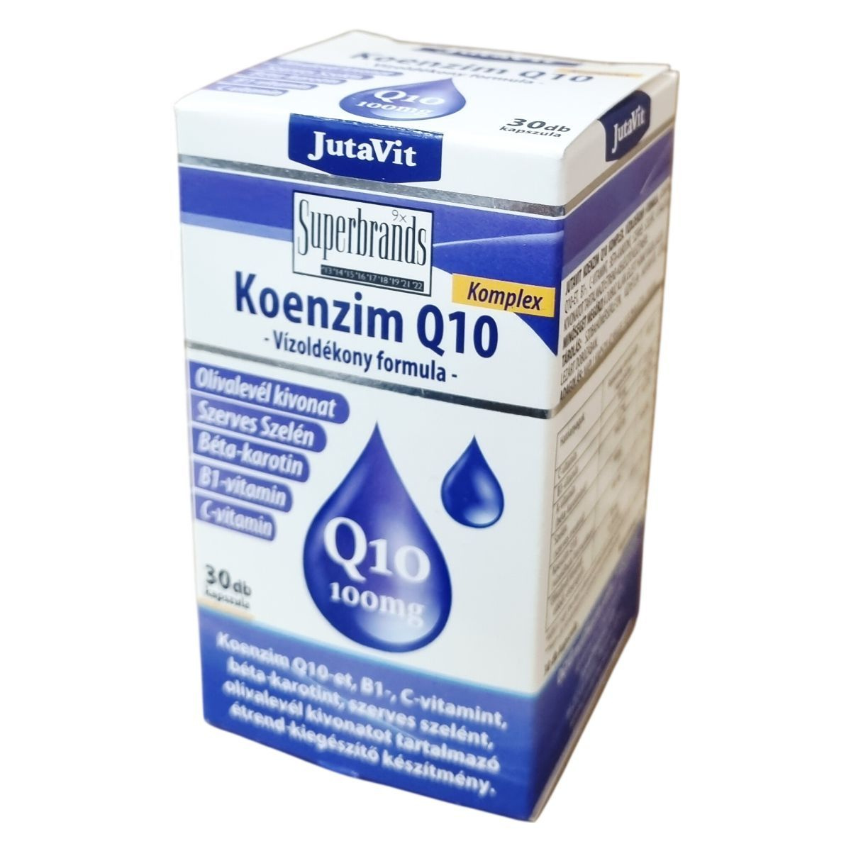 A JutaVit Komplex Koenzim Q10 kapszula egy vitaminokkal és szerves szelénnel kiegészített készítmény, amely továbbá olívalevél kivonatot és béta-karotint is tartalmaz. A termék vízoldékony koenzim Q10 formulát használ, amely 100 mg hatóanyagot biztosít egy adagban. A komplex összetétel hozzájárulhat az antioxidáns védelemhez és az általános jó közérzet támogatásához. A kapszulák száma 30 db, nettó tömegük 20,4 g. A termék szobahőmérsékleten, napfénytől védve, eredeti, lezárt csomagolásban tárolandó, és kizárólag felnőtt fogyasztóknak ajánlott az ajánlott mennyiség szerint.