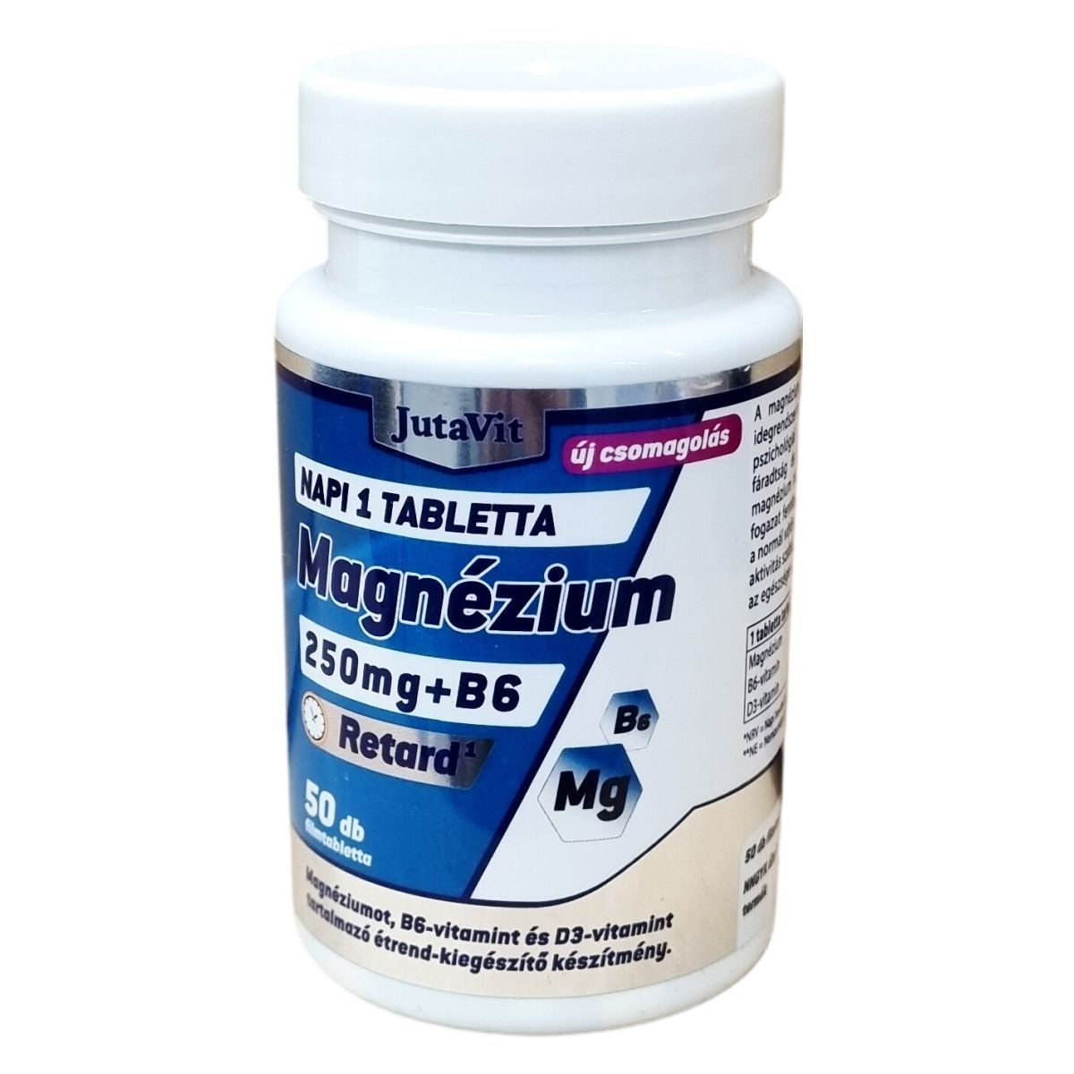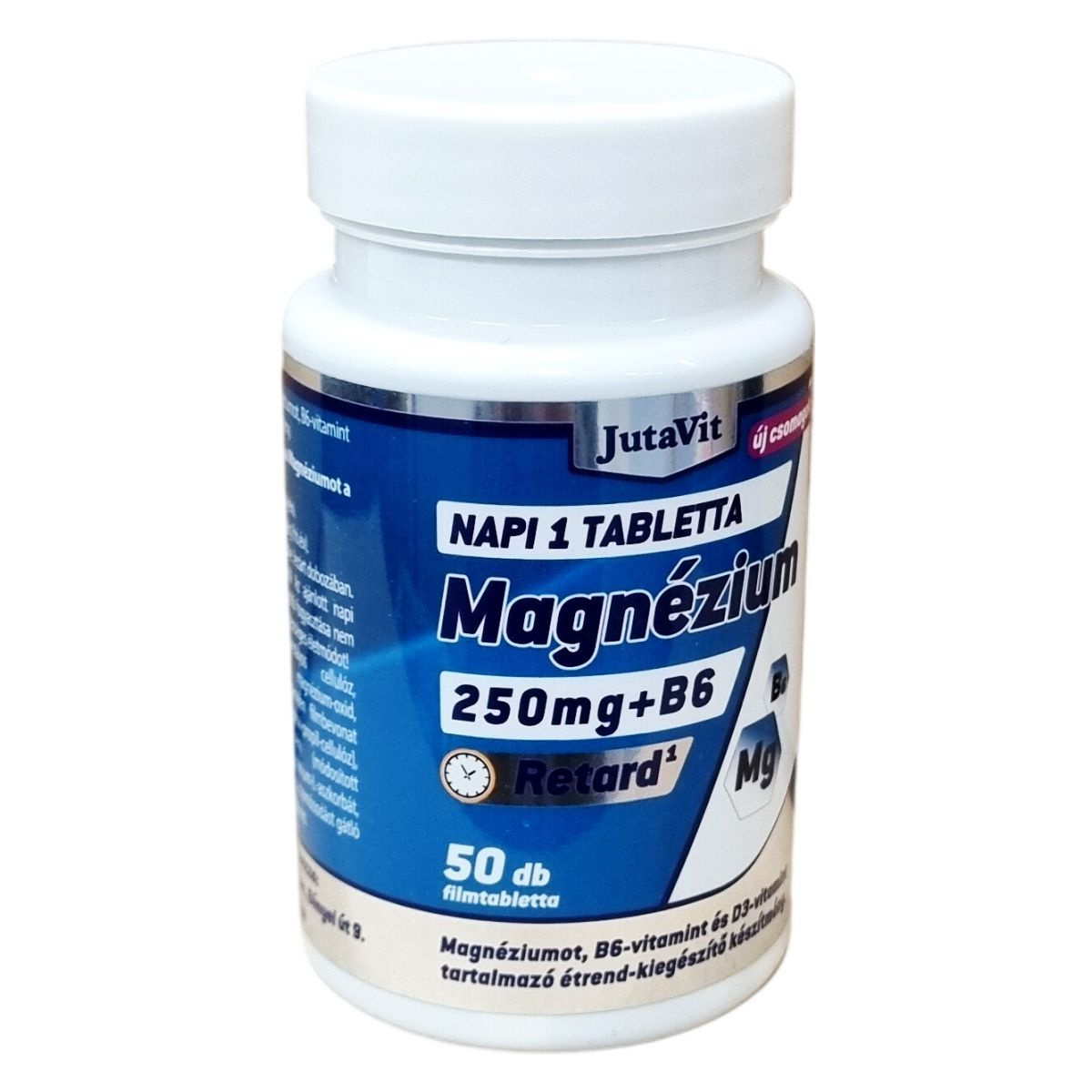 A JutaVit Magnézium + B6 + D3 Retard egy étrend-kiegészítő, amely magnéziumot, B6-vitamint és D3-vitamint tartalmaz. A retard formula fokozatosan adagolja a magnéziumot a szervezetnek, ezáltal biztosíthatja a hosszabb ideig tartó hatást. A magnézium és a B6-vitamin hozzájárulhat az idegrendszer megfelelő működéséhez, a normál pszichológiai funkciók fenntartásához, valamint a fáradtság és kifáradás csökkentéséhez. A magnézium részt vehet a normál csontozat és fogazat fenntartásában. A B6-vitamin támogathatja a normál vörösvérsejt képződést és a hormonális aktivitás szabályozását. A D-vitamin hozzájárulhat az egészséges izomfunkció fenntartásához.