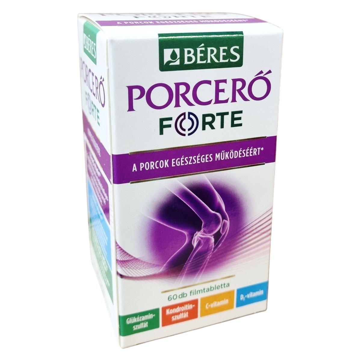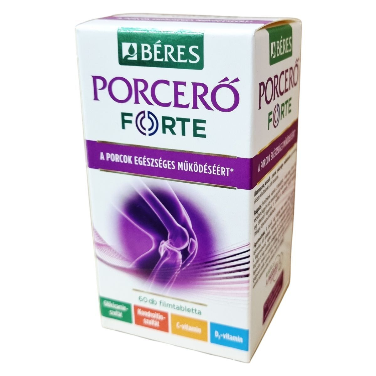 A Béres Porcerő FORTE egy komplex étrend-kiegészítő, amely C- és D3-vitamint, valamint a porcok természetes alkotórészeit, glükózamin-szulfátot és kondroitin-szulfátot tartalmaz. A C-vitamin hozzájárulhat a megfelelő kollagénképződéshez, ezáltal támogatva a porcok megfelelő működését. A D3-vitamin elősegítheti az egészséges csontozat fenntartását, valamint a kalcium és foszfor normál felszívódását és hasznosulását, továbbá támogathatja az egészséges izomfunkció fenntartását. A glükózamin-szulfát és kondroitin-szulfát a porcszövet természetes alkotórészei. A termék használata különösen ajánlott sportolóknak, idősebb felnőtteknek és idős korúaknak a porcok egészséges működésének támogatására. A készítményt célszerű legalább 3 hónapig folyamatosan alkalmazni. A termék filmtabletta formában készül, egy doboz 60 darabot tartalmaz, amelynek tömege 1,785 g/tabletta. A készítmény nem alkalmas tengeri kagylókra vagy rákfélékre érzékenyek számára, illetve bizonyos egészségügyi állapotok esetén nem ajánlott a szedése.