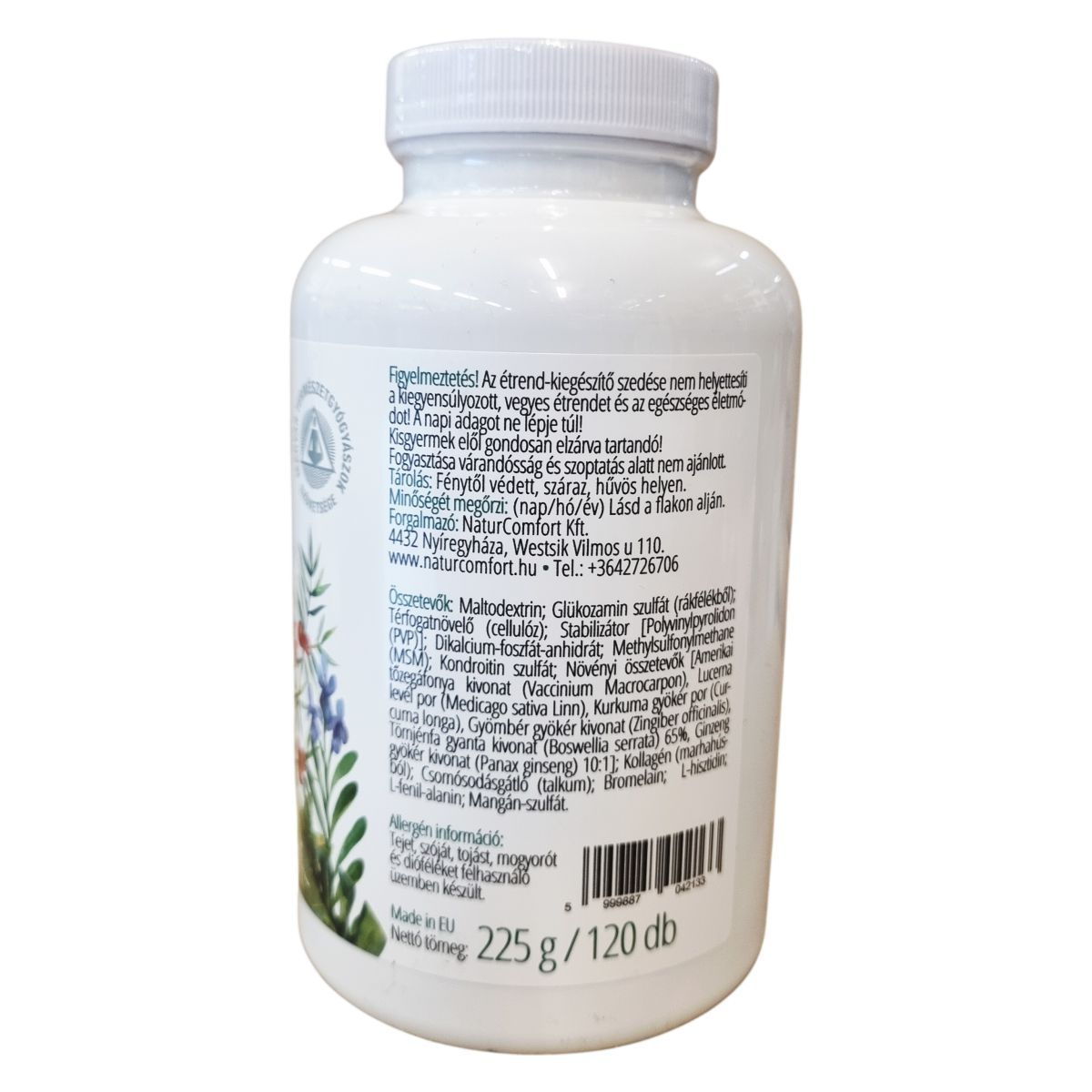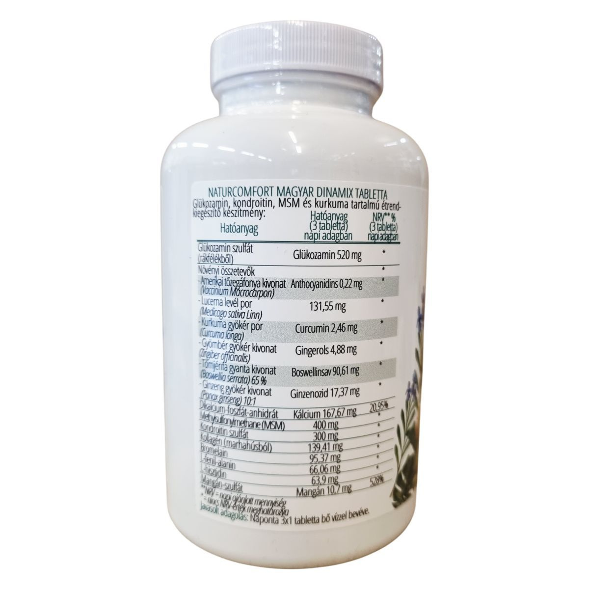 A NaturComfort Magyar Dinamix tabletta 120 darabos kiszerelésben kapható étrend-kiegészítő. A készítmény glükozamin-szulfátot tartalmaz rákfélékből, valamint egyéb hatóanyagokat, mint a kondroitin-szulfát, MSM (metil-szulfonil-metán) és különféle növényi kivonatokat (amerikai tőzegáfonya, lucerna levél, kurkuma gyökér, gyömbér gyökér, tömjénfa gyanta, ginzeng gyökér) a változatos összetétel érdekében. Továbbá kollagént, bromelaint, L-fenil-alanint, L-hisztidint és mangán-szulfátot is tartalmaz. Az étrend-kiegészítő glükozamin és kondroitin forrása rákfélékből származik. Az adagolás napi 3 tabletta, amelyet bő vízzel javasolt bevenni. A termék származási helye az Európai Unió. Az összetevők között szerepelnek stabilizátorok, térfogatnövelők és csomósodásgátlók is, melyek segítik a termék minőségének megőrzését. A készítményt olyan üzemben gyártották, ahol tejet, szóját, tojást, mogyorót és dióféléket is felhasználnak. A termék nem ajánlott várandósság és szoptatás alatt, valamint kisgyermekek elől gondosan elzárva kell tartani. A terméket fénytől védett, száraz, hűvös helyen javasolt tárolni.