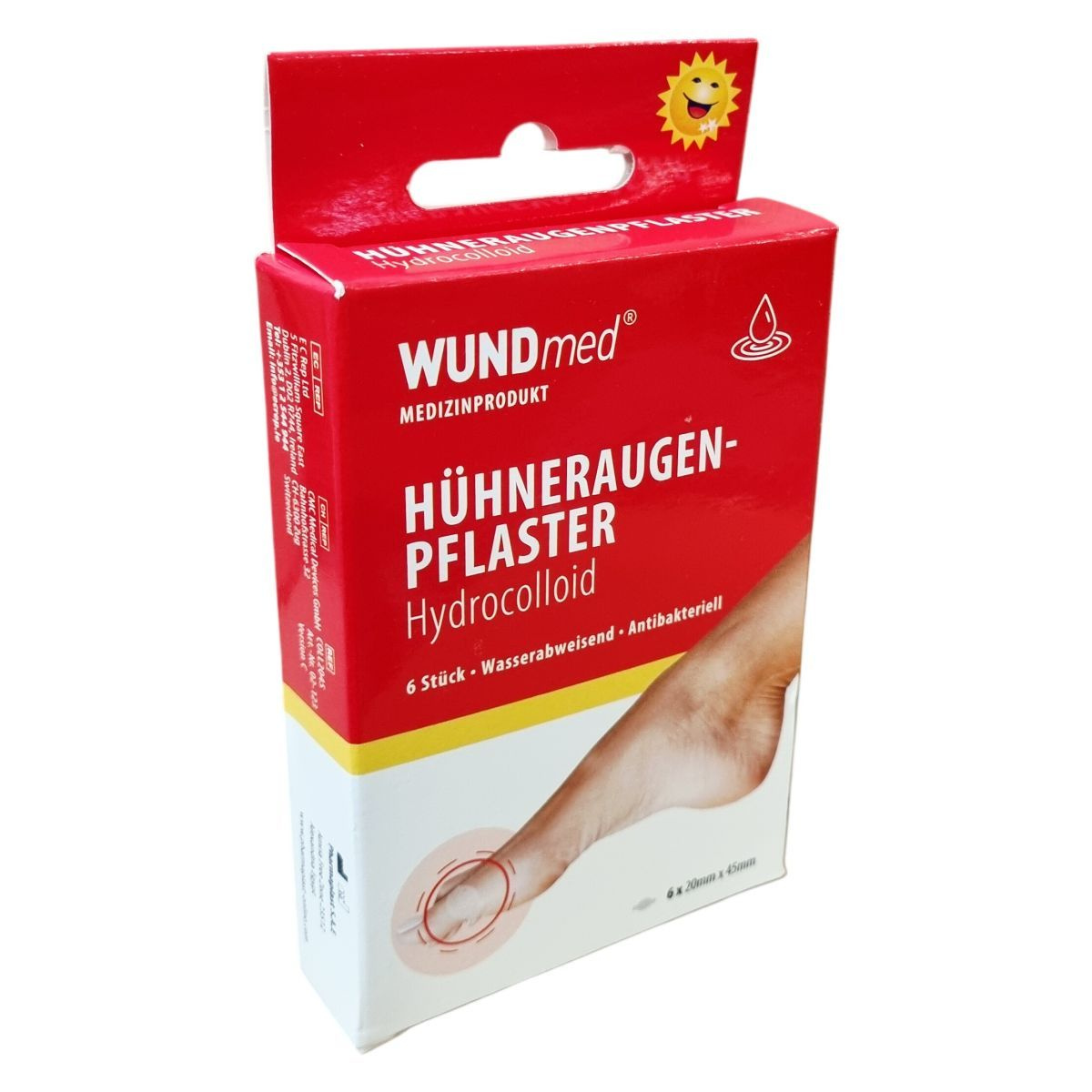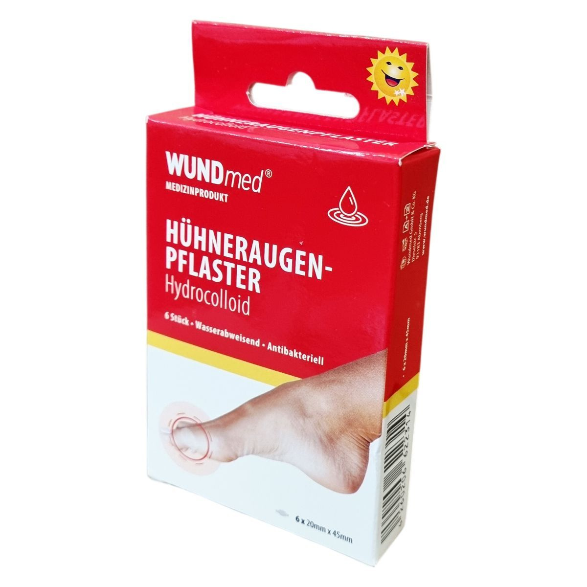 A WUNDmed® Hydrokolloidos Tyúkszemtapasz hatékony segítséget nyújt a tyúkszem kezelésében. A hidrokolloid réteg a test saját nedvével gélt képez, amely felpuhítja a megkeményedett bőrt és elősegíti a tyúkszem eltávolítását. A tapasz vízálló és antibakteriális tulajdonságokkal rendelkezik, ami javítja a használat kényelmét és higiénikus maradást biztosít. A termék kiszerelése 6 darab, mérete 20 mm x 45 mm. A csomagolás a minőség megőrzésének időpontját tartalmazza, a terméket a megfelelő gyártási és forgalmazási adatokat feltüntetve biztosítják.
