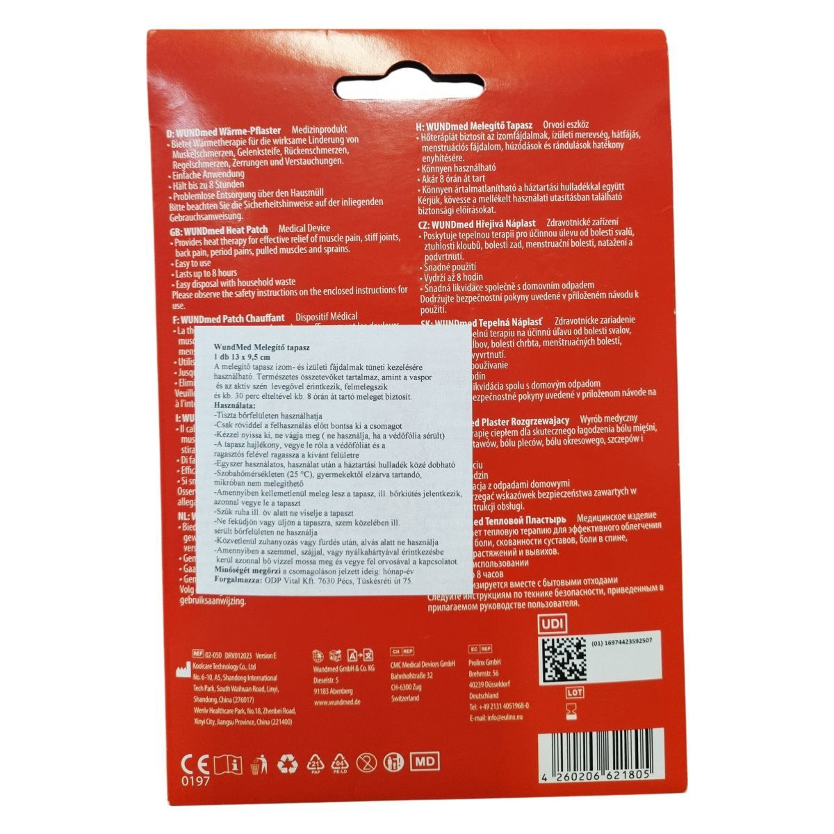 A WUNDmed Melegítő tapasz orvosi eszköz, amely hőterápiát biztosít a húsz izom- és ízületi panasz hatékony enyhítésére, így alkalmas hátfájás, menzesz alatti fájdalmak, húzódások és rándulások kezelésére. A tapasz légköri oxigénnel érintkezve melegszik fel, cirka 30 perc alatt, és a hőhatás mintegy 8 órán keresztül tart. Egyszerű a használata, alkalmazása során csak a védőfóliát kell eltávolítani, majd a tapaszt a bőrre helyezni. A használat után a tapasz a háztartási hulladék részeként ártalmatlanítható. Fontos a használati utasítás betartása és a biztonsági előírások követése, hogy elkerülje a kellemetlenségeket vagy sérüléseket.