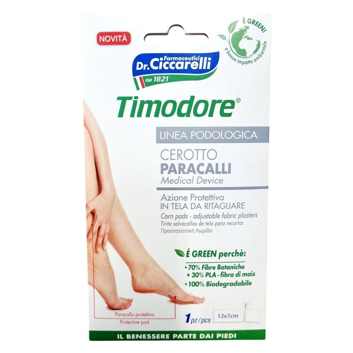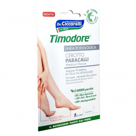A Dr.Ciccarelli Timodore Cerotto Paracalli egy orvostechnikai eszköz, amely védelmet nyújt a bőrkeményedések ellen. A tapasz vágható, így a kívánt méretre és formára alakítható, hogy pontosan illeszkedjen a védeni kívánt területre. A termék 70% növényi rostot és 30% PLA-t tartalmaz, amely kukoricából származó rost, és teljesen biológiailag lebomló. A tapasz latexmentes, így érzékeny bőrűek is használhatják. A termék dermatológiailag tesztelt, és a gyártó javasolja, hogy alkalmazás előtt lábfürdőt vegyenek Timodore Sali Ossidanti használatával. A tapaszt naponta cserélni kell a higiénia fenntartása érdekében. A termék kizárólag felnőttek számára készült, és külső használatra ajánlott.