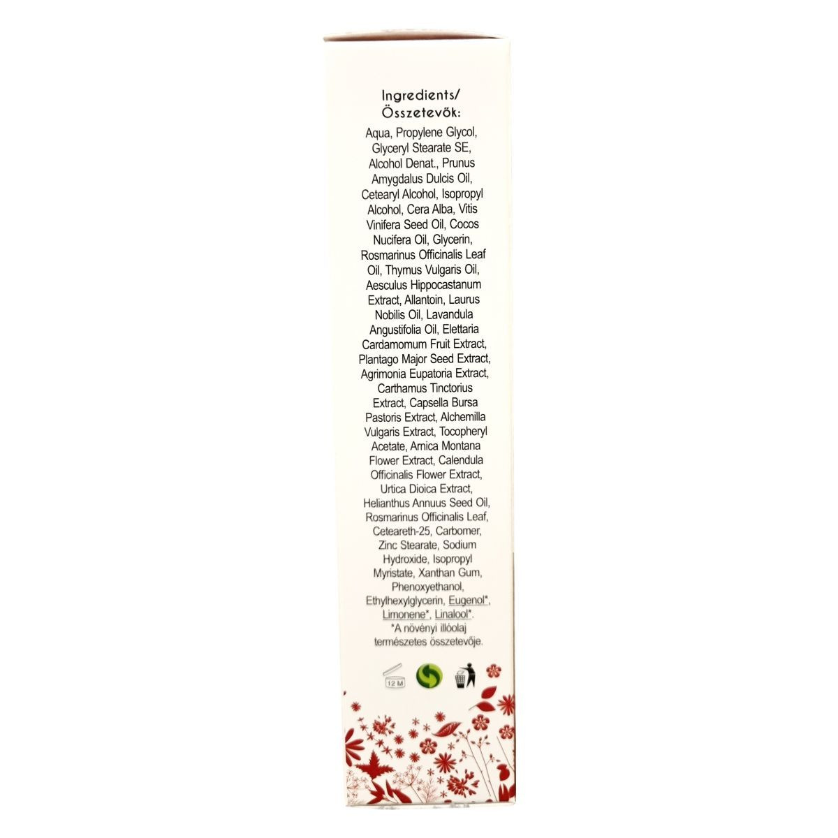 Aqua, Propylene Glycol, Glyceryl Stearate SE, Alcohol Denat., Prunus Amygdalus Dulcis Oil, Cetearyl Alcohol, Isopropyl Alcohol, Cera Alba, Vitis Vinifera Seed Oil, Cocos Nucifera Oil, Glycerin, Rosmarinus Officinalis Leaf Oil, Thymus Vulgaris Oil, Aesculus Hippocastanum Extract, Allantoin, Laurus Nobilis Oil, Lavandula Angustifolia Oil, Elettaria Cardamomum Fruit Extract, Plantago Major Seed Extract, Agrimonia Eupatoria Extract, Carthamus Tinctorius Extract, Capsella Bursa Pastoris Extract, Alchemilla Vulgaris Extract, Tocopheryl Acetate, Arnica Montana Flower Extract, Calendula Officinalis Flower Extract, Urtica Dioica Extract, Helianthus Annuus Seed Oil, Ceteareth-25, Carbomer, Zinc Stearate, Sodium Hydroxide, Isopropyl Myristate, Xanthan Gum, Phenoxyethanol, Ethylhexylglycerin, Eugenol, Limonene, Linalool
