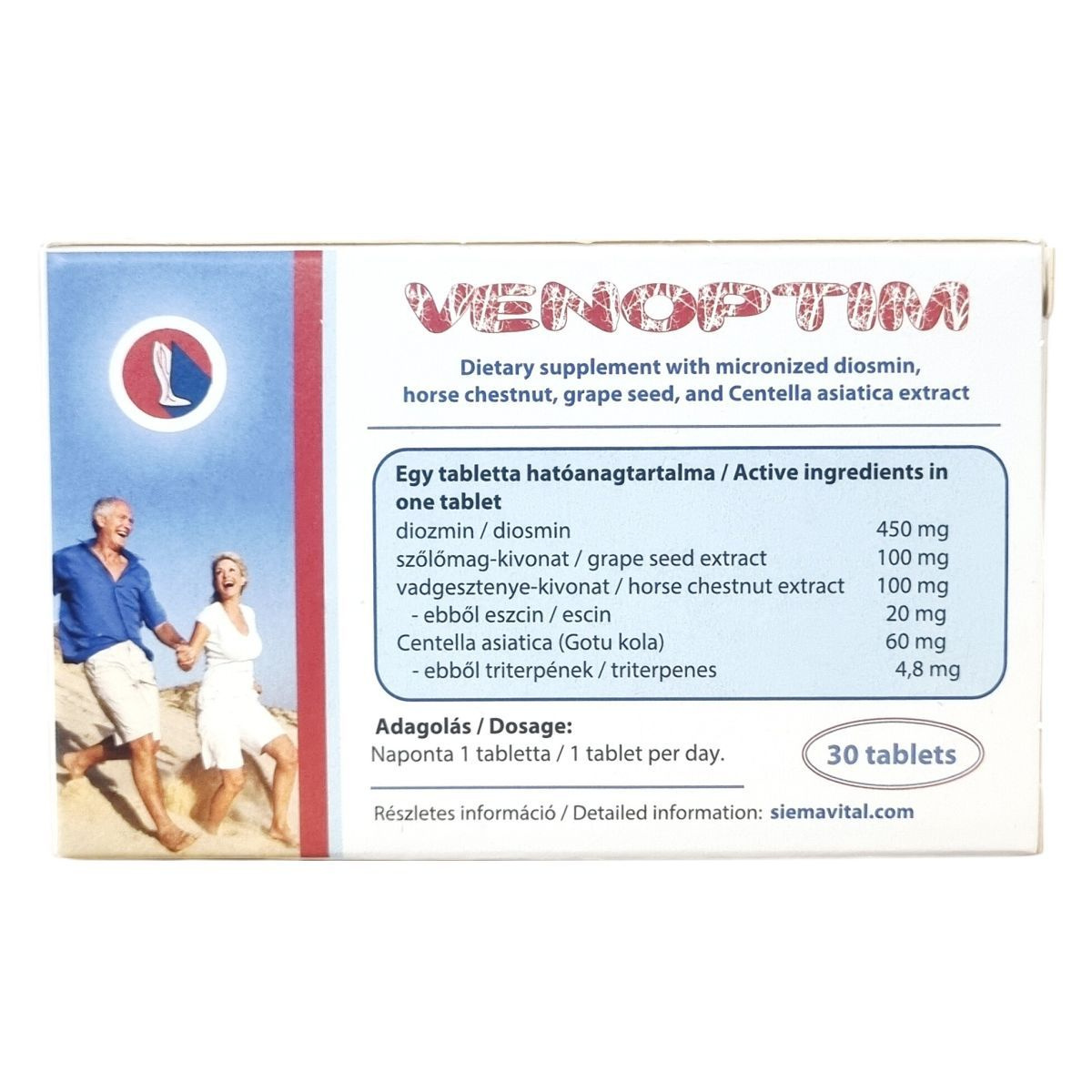 A Venoptim tabletta a Sabinsa Corporation, USA által bejegyzett Venocin® vadgesztenye-kivonatot, az Indena S.p.A., Olaszország által bejegyzett LeucoSelect® szőlőmag-kivonatot és a Centellin® Centella asiatica kivonatot tartalmazza, mely összetevők különleges minőségét biztosítják. A mikronizált diozmin (gyártója: HealthTech BioActives SLU, Spanyolország) alkotóeleme segítheti a vénák egészségének fenntartását. Egy tabletta 450 mg diozmin, 100 mg szőlőmag-kivonat, 100 mg vadgesztenye-kivonat (ebből 20 mg eszcin) és 60 mg Centella asiatica kivonatot (ebből 4,8 mg triterpének) tartalmaz. A termék 30 darab tablettát tartalmaz, melyek előállítása során több emulgeálószert és színezéket is felhasználnak. A készítmény használata a gyártói ajánlások szerint javasolt, naponta egy tabletta fogyasztásával. A termék célja az egészséges vénák támogatása, amely a vadgesztenye-kivonat hozzájárulásával lehetséges.