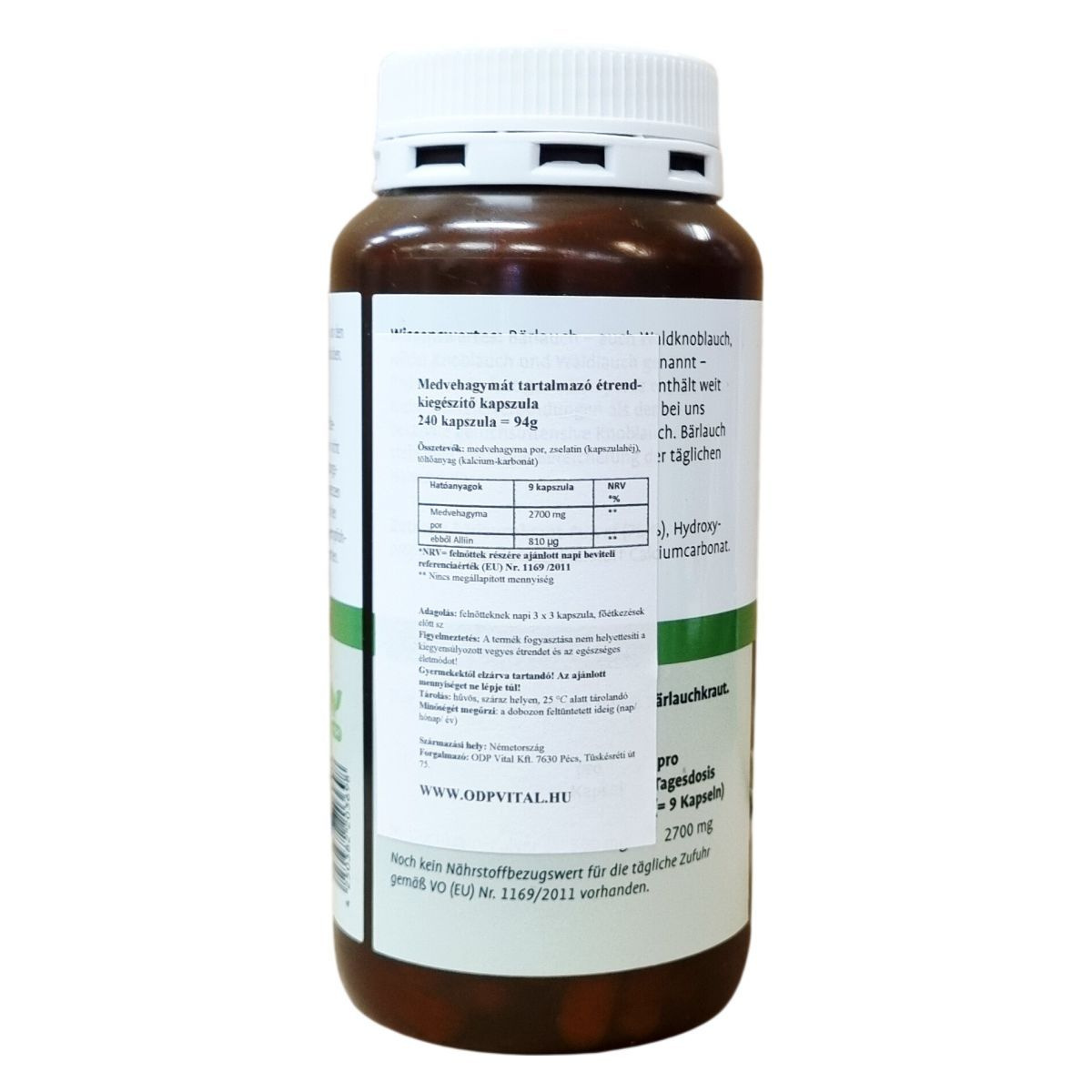 A termék medvehagymát tartalmazó étrend-kiegészítő kapszula, amely 300 mg hatóanyagot biztosít kapszulánként, összesen 240 kapszulás kiszerelésben. A kapszulák zselatinból készülnek, kalcium-karbonát töltőanyaggal. A termék Németországban készül, és olyan körülmények között kell tárolni, hogy fénytől védett, száraz helyen, 25 °C alatt maradjon. A terméket nem szabad étrend helyettesítőjeként használni, hanem a kiegyensúlyozott, változatos étrend és az egészséges életmód kiegészítőjeként javasolt alkalmazni.