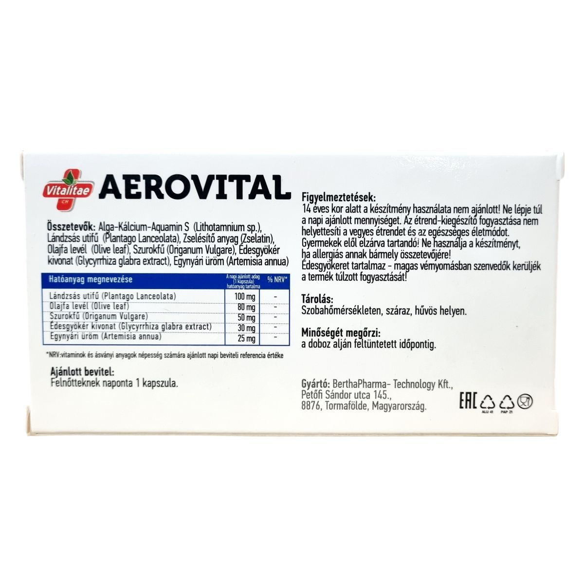 A Vitalitae CH kapszula kizárólag természetes hatóanyagokat tartalmaz. A készítmény fő alkotói között szerepel az alga-kálcium forrásként, valamint gyógynövények, mint a lándzsás útifű, olajfa levél, szurokfű, édesgyökér kivonat és egynyári üröm. Az étrend-kiegészítő biológiailag aktív összetevőkkel készült, célja a természetes hatóanyagok biztosítása a szervezet számára. A termék kapszula formában kerül forgalomba, 30 darabos kiszerelésben, és felnőttek számára ajánlott napi egy kapszula fogyasztása. A készítmény fogyasztása nem helyettesíti a kiegyensúlyozott étrendet és az egészséges életmódot.