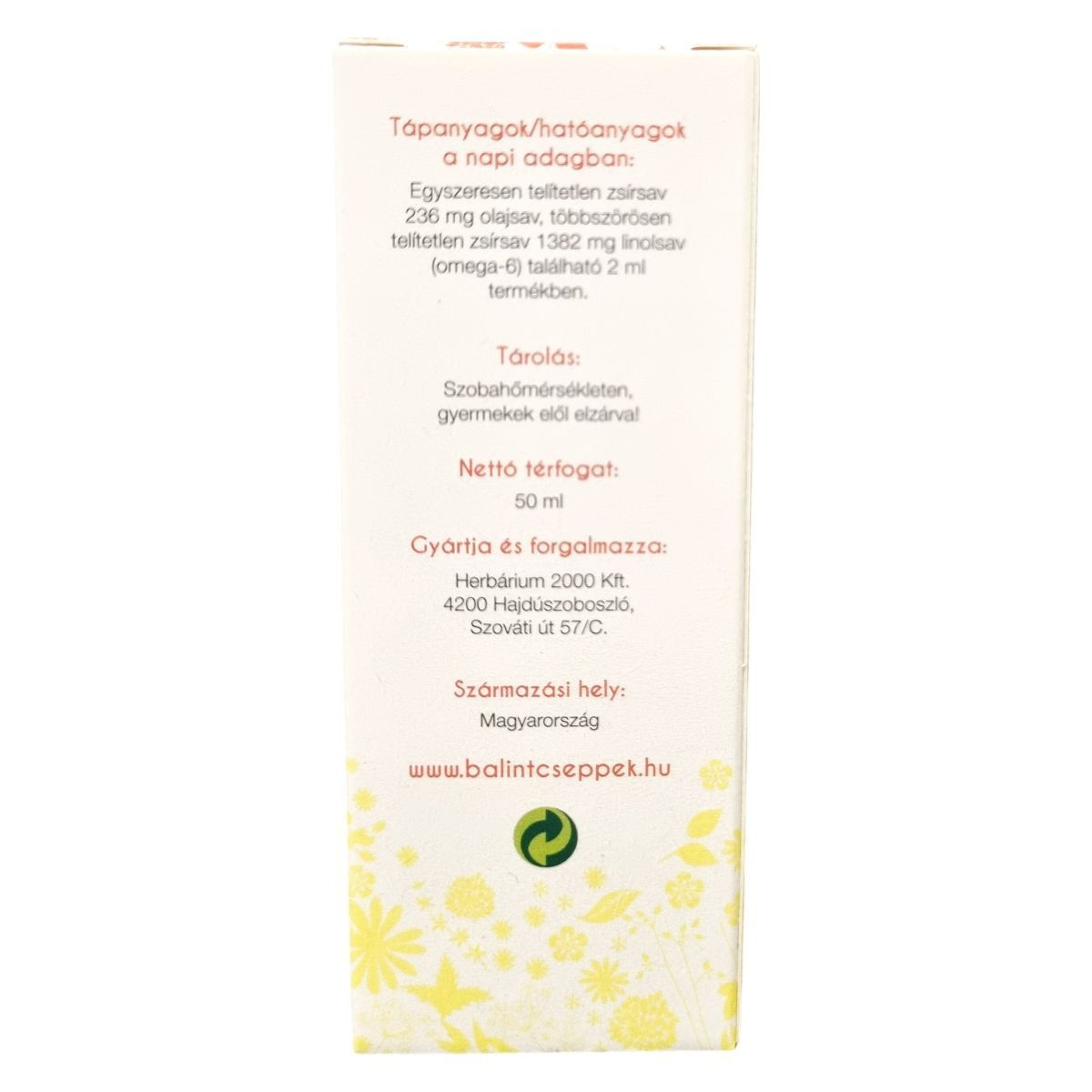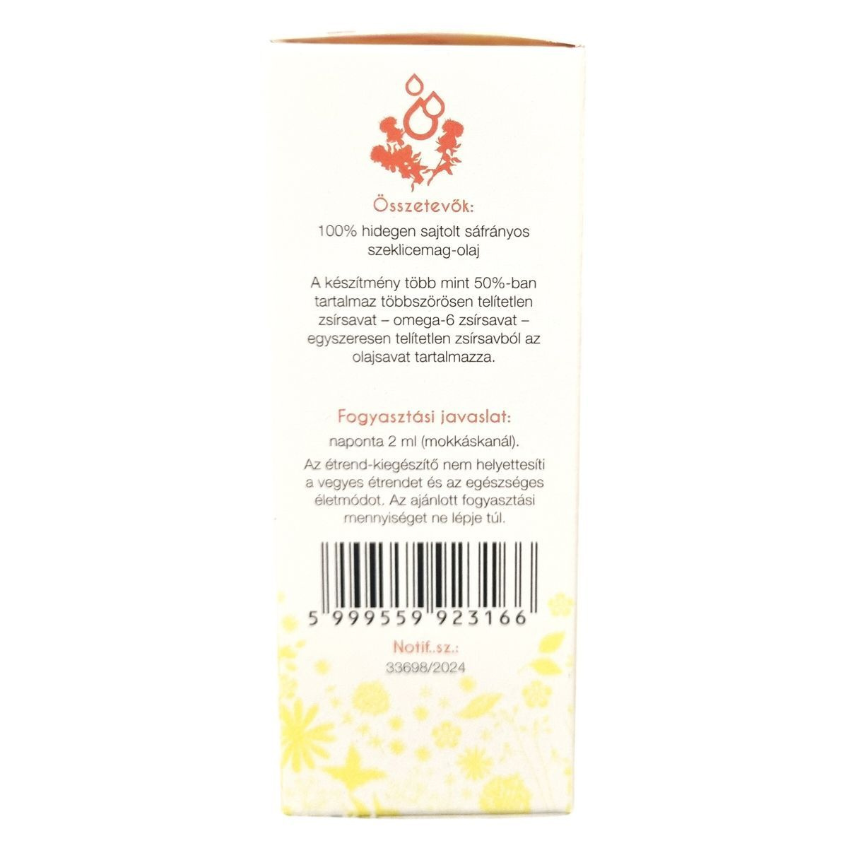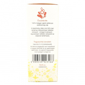 A termék több mint 50%-ban tartalmaz többszörösen telítetlen omega-6 zsírsavat, valamint egyszeresen telítetlen zsírsavként olajsavat. Nettó térfogata 50 ml, Magyarországon készül. A címkén feltüntetett azonosító, a Notif. szám 33698/2024. A termék folyékony formában van, és használata a napi 2 ml adag betartását igényli.