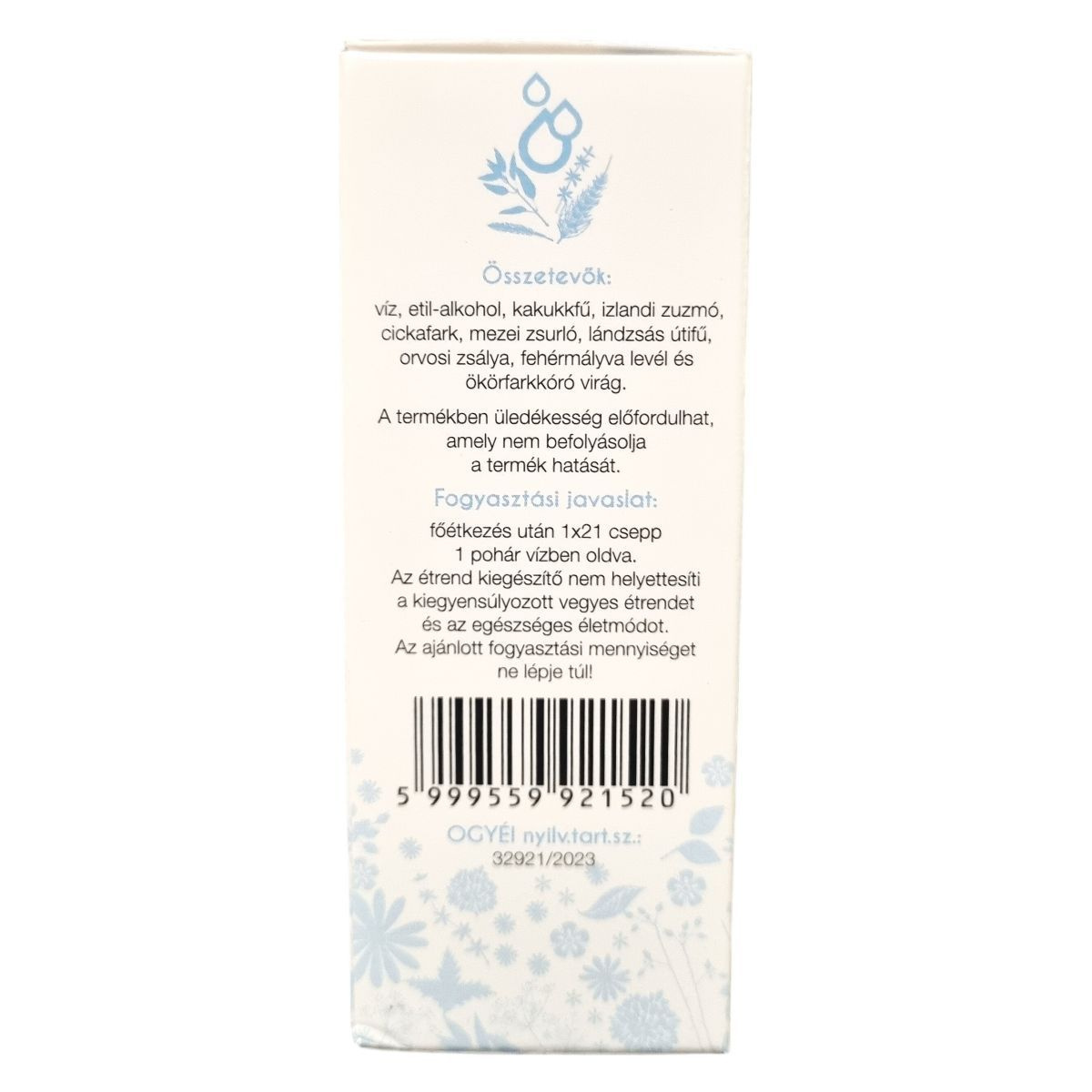 Víz, etil-alkohol, kakukkfű, izlandi zuzmó, cickafark, mezei zsurló, lándzsás útifű, orvosi zsálya, fehérmályva levél, ökörfarkkóró virág.