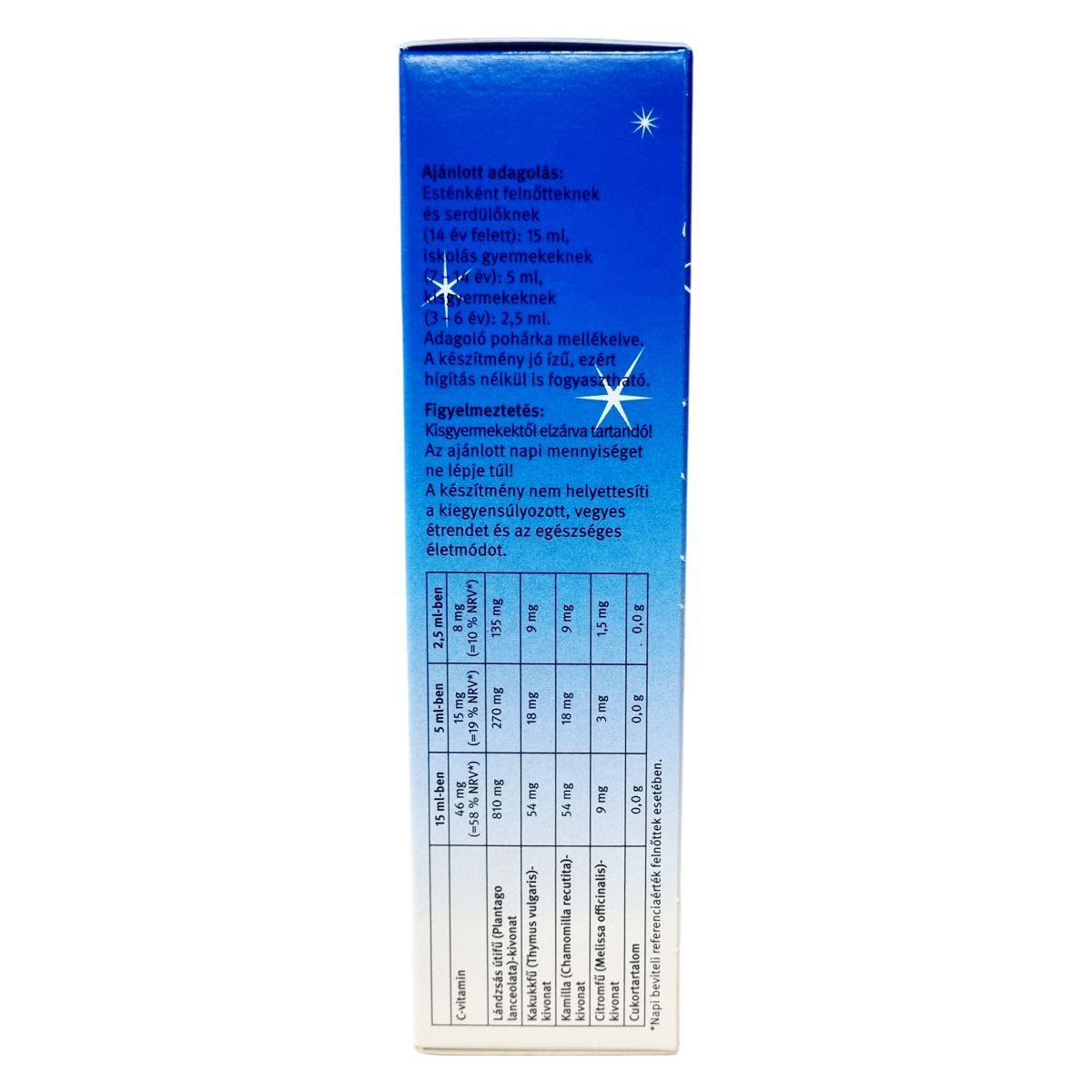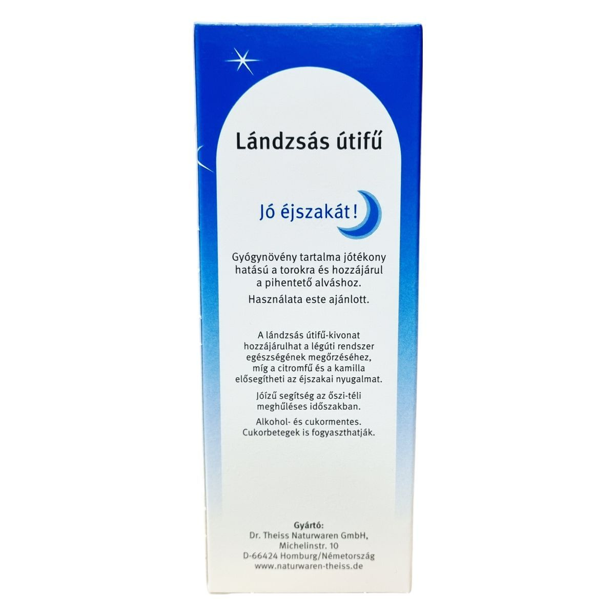 A Dr. Theiss-féle lándzsás útifűszirup "jó éjszakát" változata nem csak jóízű segítség a légutak egészségének megőrzésére az őszi-téli meghűléses időszakban, hanem egyéb gyógynövény-tartalma révén (kakukkfű, citromfű, kamilla) hozzájárul a pihentető alváshoz. Az étrend-kiegészítő használata kifejezetten este ajánlott. Alkoholmentes, hozzáadott cukrot nem tartalmaz, így a gyermekek szép mosolya, fogsora nincs veszélyben. Cukorbetegek is fogyaszthatják. A készítmény nem helyettesíti a kiegyensúlyozott, vegyes étrendet és az egészséges életmódot.
