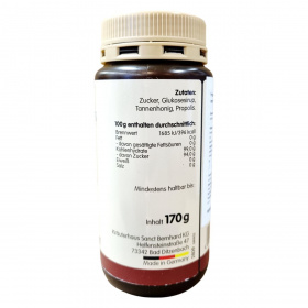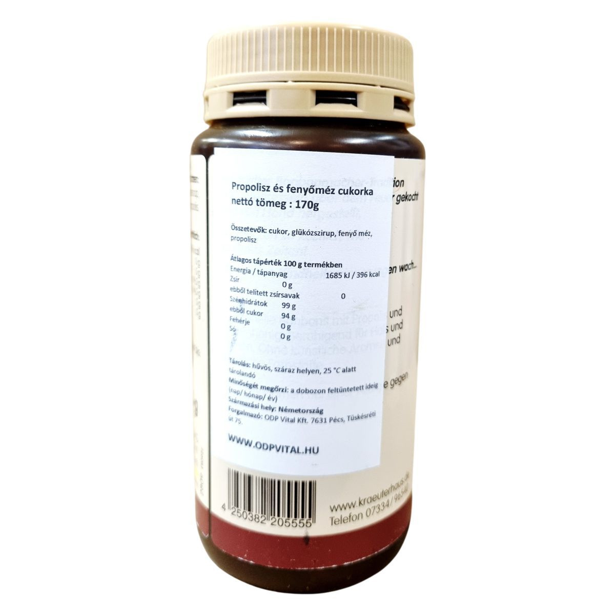 A Propolisz és fenyőméz cukorka Németországban készült. Nettó tömege 170 g. A termék hagyományos édesség, amely cukrot, glükózszirupot, fenyőmézet és propoliszt tartalmaz.