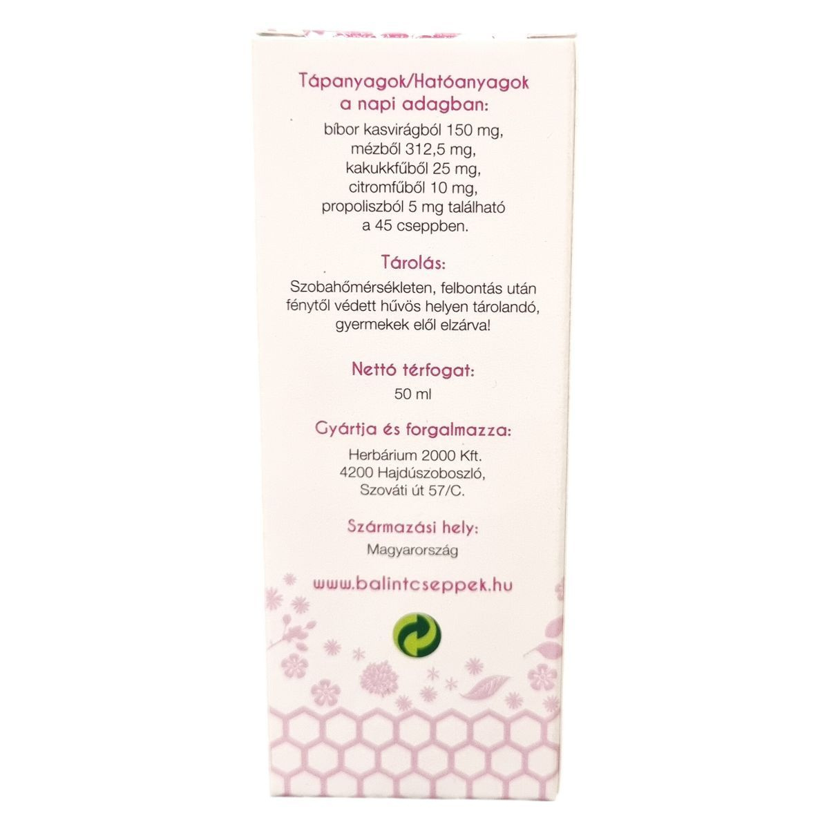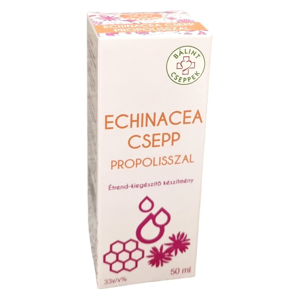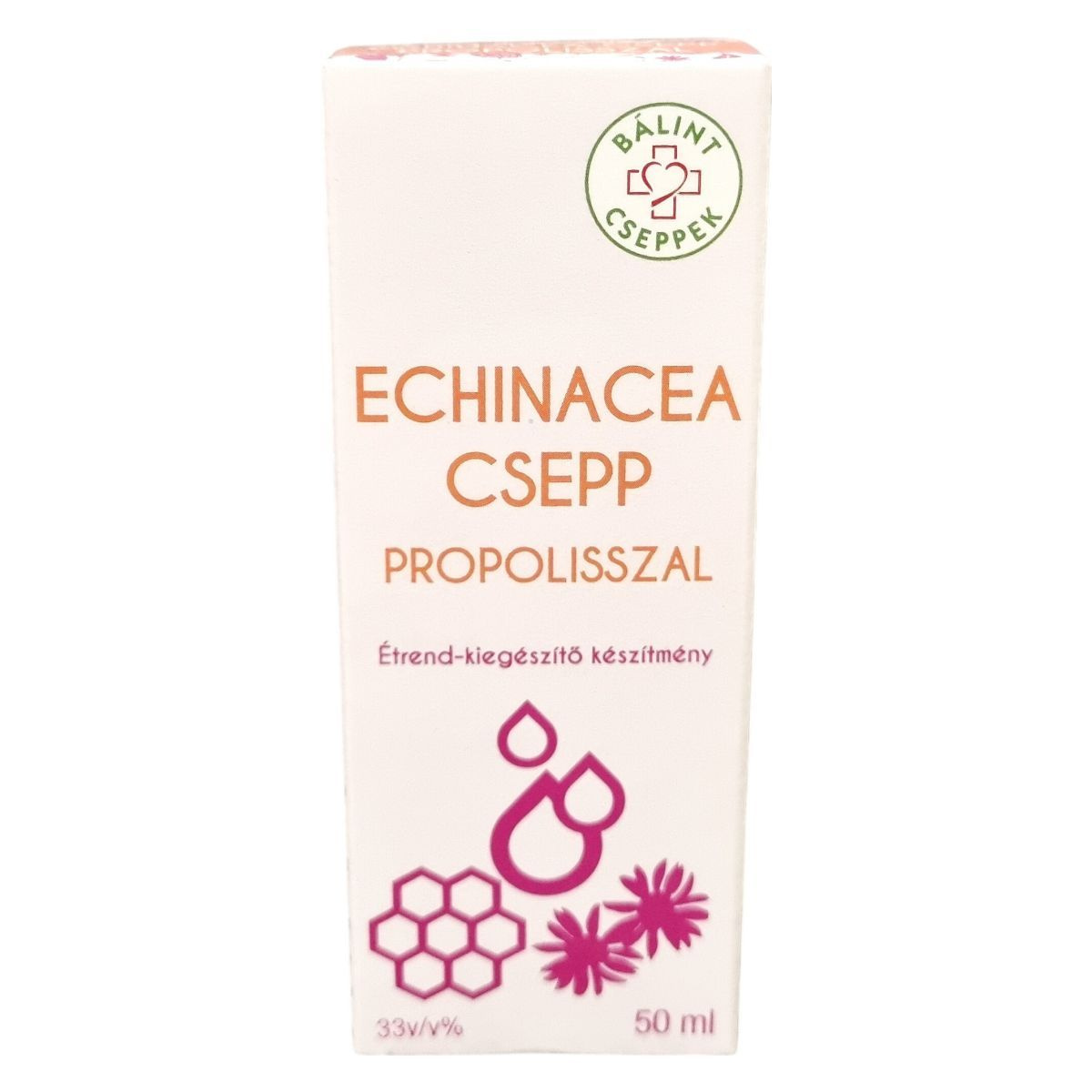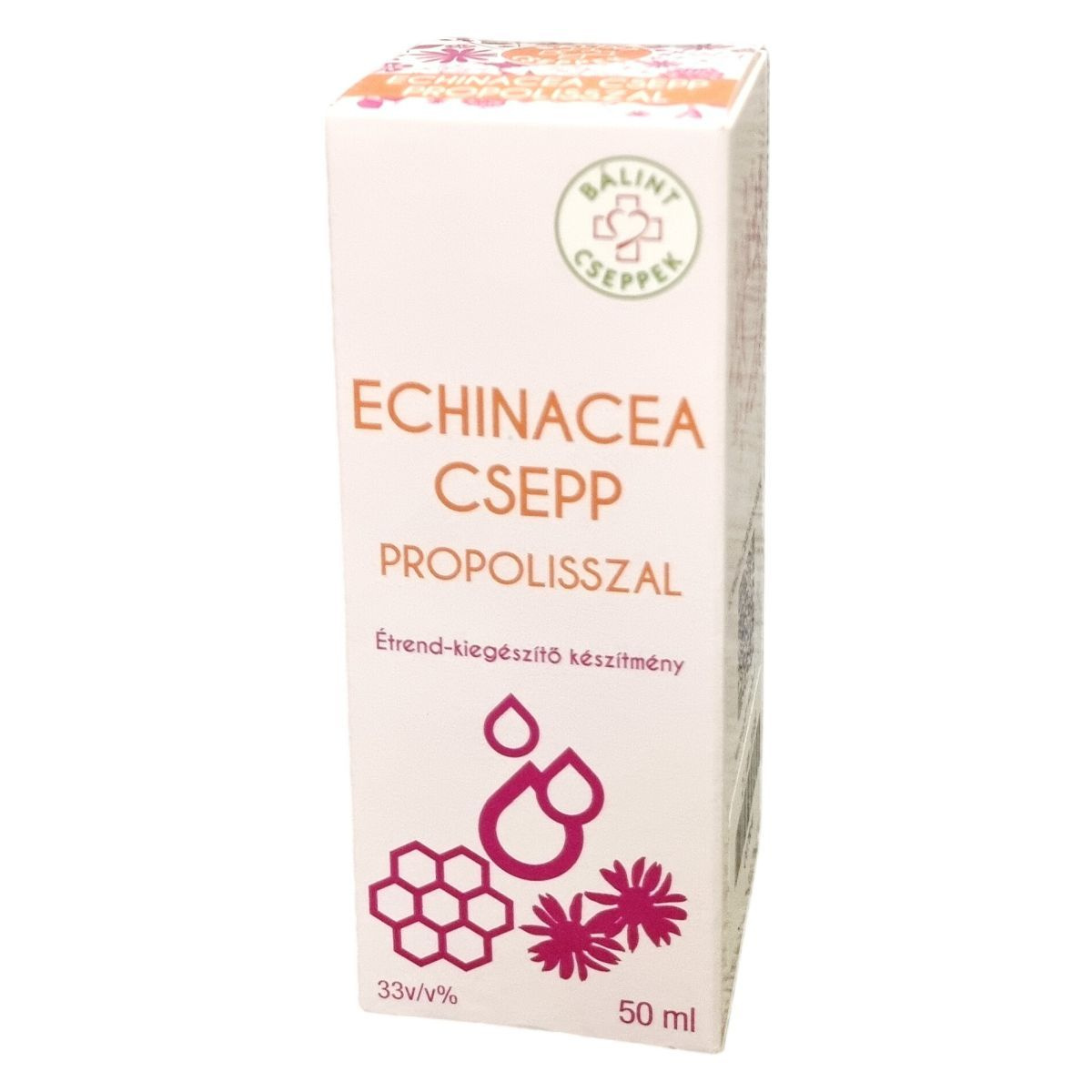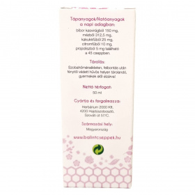 A BÁLINT Echinacea csepp propolisszal egy olyan étrend-kiegészítő, amely bibor kasvirág, méz, kakukkfű, citromfű és propolisz vizes alkoholos kivonatát tartalmazza. A propolisz és az echinacea hozzájárulhat az immunrendszer működéséhez. A termék fogyasztása előtt fel kell rázni, és az esetlegesen megjelenő üledék nem befolyásolja a termék minőségét. A napi adag 45 cseppben megtalálható a fent felsorolt hatóanyagok mennyisége. A terméket szobahőmérsékleten, felbontás után fénytől védett hűvös helyen kell tárolni, és gyermekek elől elzárva tartandó. A termék Magyarországon készül, és a Herbárium 2000 Kft. gyártja és forgalmazza.