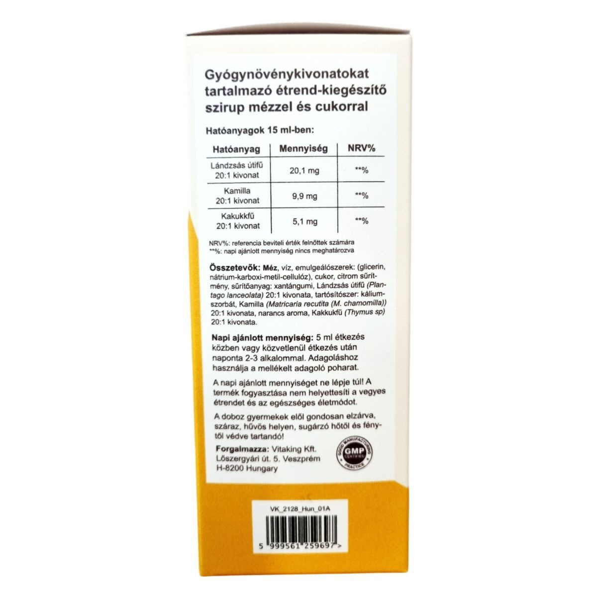 A Vitaking Lándzsás útifű szirup egy gyógynövénykivonatokat tartalmazó étrend-kiegészítő, amely mézzel és cukorral készült. A termék lándzsás útifű, kamilla és kakukkfű kivonatokat tartalmaz, amelyek hozzájárulhatnak a légzőrendszer és a torok jóllétéhez, valamint a friss lehelethez. A szirup 100% alkoholmentes, így gyerekek és felnőttek számára egyaránt alkalmas. A termék minőségét megőrzi a dobozon és a címke oldalán jelzett hónap végéig. A szirupot a Vitaking Kft. forgalmazza, és OGYÉI engedéllyel rendelkezik.