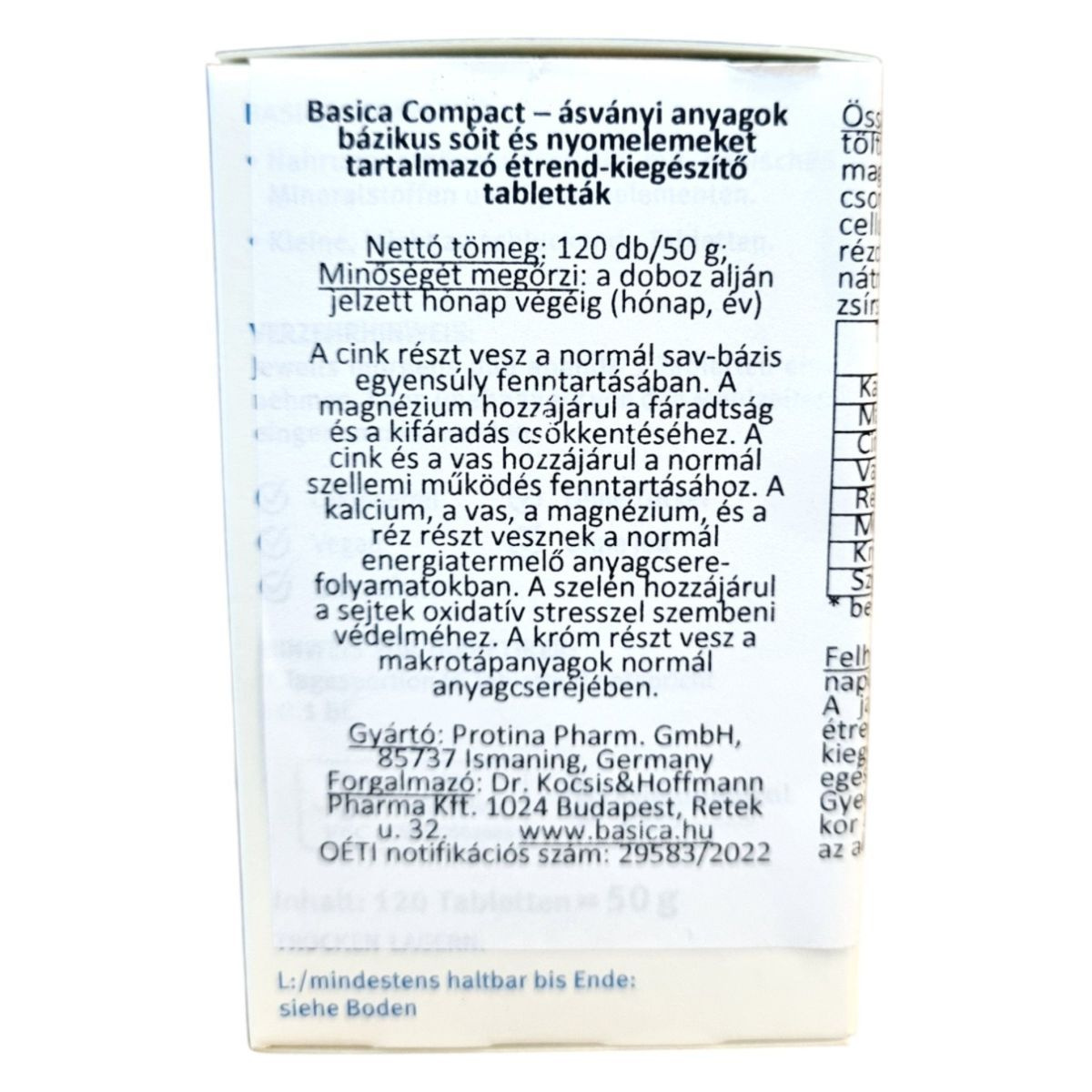 A Basica Compact étrend-kiegészítő tabletták bázikus sókat és nyomelemeket tartalmaznak, amelyek hozzájárulhatnak a normál sav-bázis egyensúly fenntartásához. A cink részt vehet a normál sav-bázis egyensúly fenntartásában, míg a magnézium segíthet a fáradtság és a kifáradás csökkentésében. A cink és a vas támogathatják a normál szellemi működést. A kalcium, a vas, a magnézium és a réz részt vehetnek a normál energiatermelő anyagcsere-folyamatokban. A szelén hozzájárulhat a sejtek oxidatív stresszel szembeni védelméhez, míg a króm részt vehet a makrotápanyagok normál anyagcseréjében. A termék gyártója a Protina Pharm. GmbH, forgalmazója a Dr. Kocsis & Hoffmann Pharma Kft.