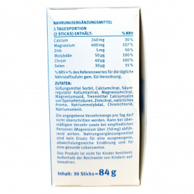 Süßungsmittel Sorbit, Calciumcitrat, Säureregulator Kaliumtartrat, Magnesiumcitrat, Magnesiumoxid, Trennmittel Calciumsalze von Speisefettsäuren, Zinkcitrat, natürliches Aroma, Natriummolybdat, Chromchlorid, Natriumselenit.