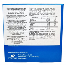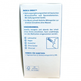 A Basica Direkt egy bázikus ásványi anyagokat és nyomelemeket tartalmazó étrend-kiegészítő, amely mikrogyöngy formájában, víz nélkül is könnyen bevehető. A termék cinket, magnéziumot, kalciumot, szelént és krómot tartalmaz, amelyek hozzájárulhatnak a normál sav-bázis egyensúly fenntartásához, a szellemi működés támogatásához, valamint a fáradtság csökkentéséhez. A termék vegán, laktózmentes, gluténmentes, cukormentes és jódmentes, így széles körben alkalmazható különböző étrendi igények esetén. A napi ajánlott mennyiség reggel és este egy-egy stick tartalmának elfogyasztása, amely függetlenül a főétkezésektől is bevehető. Fontos, hogy a megadott napi mennyiséget ne lépjük túl, és a termék nem helyettesíti a kiegyensúlyozott étrendet és az egészséges életmódot.