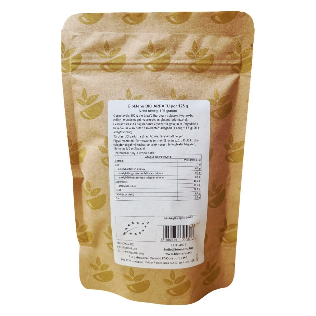 A BioMenü BIO Árpafű por egy 100% tiszta, bio minőségű termék, amely az Európai Unió mezőgazdaságából származik. A termék nettó tömege 125 gramm, és akár 25-41 adag is kinyerhető belőle. Az árpafű por nyomokban zellert, mustármagot, vadrepcét és glutént tartalmaz, ezért allergiások számára körültekintést igényelhet. A termék forgalmazója a Caleido IT-Outsource Kft., amelynek székhelye Budapest, Magyarország. A termék minőségét a HU-ÖKO-02 tanúsítvány igazolja.