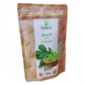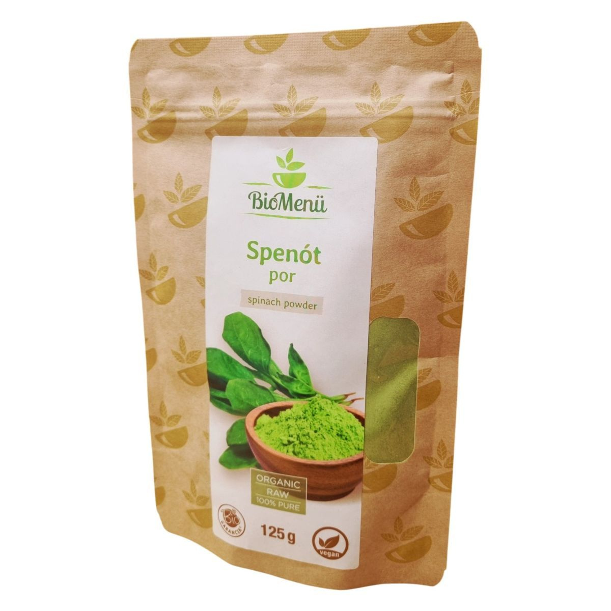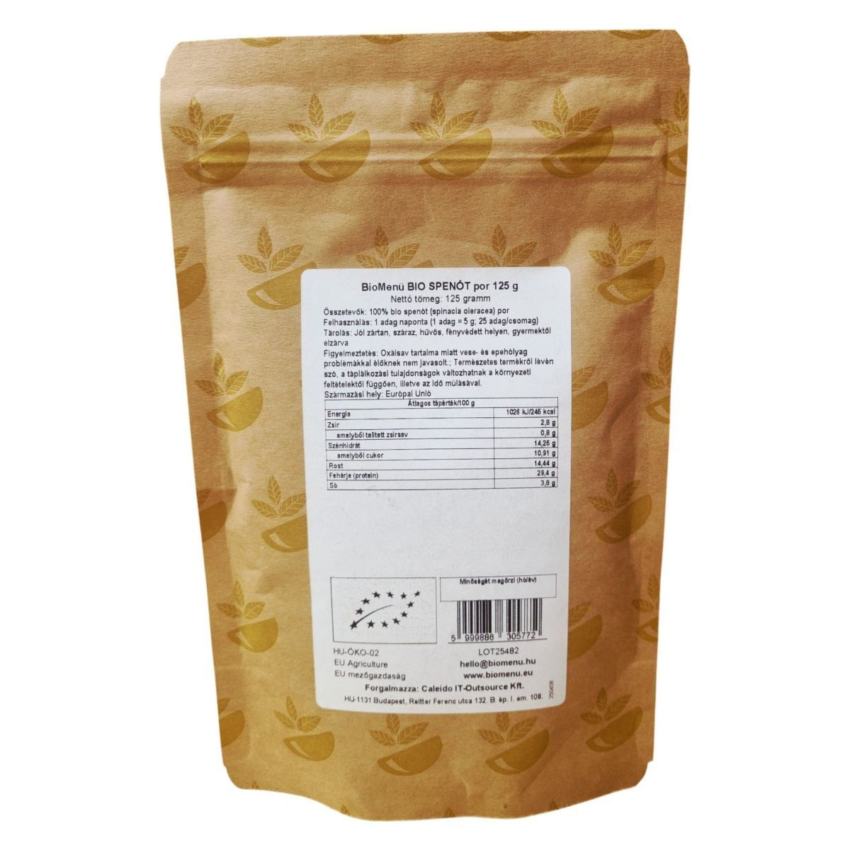 A BioMenü BIO SPENÓT por egy 100% tiszta, organikus és vegán termék, amelyet az Európai Unióban állítanak elő. A termék 125 grammos kiszerelésben kapható, és 25 adagot tartalmaz. A spenótpor gazdag fehérjében és rostban, ami hozzájárulhat az egészséges táplálkozáshoz. Az oxálsav tartalom miatt azonban nem ajánlott vese- és epehólyag problémákkal küzdőknek. A termék minőségét a HU-ÖKO-02 tanúsítvány garantálja.