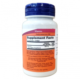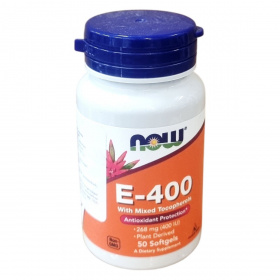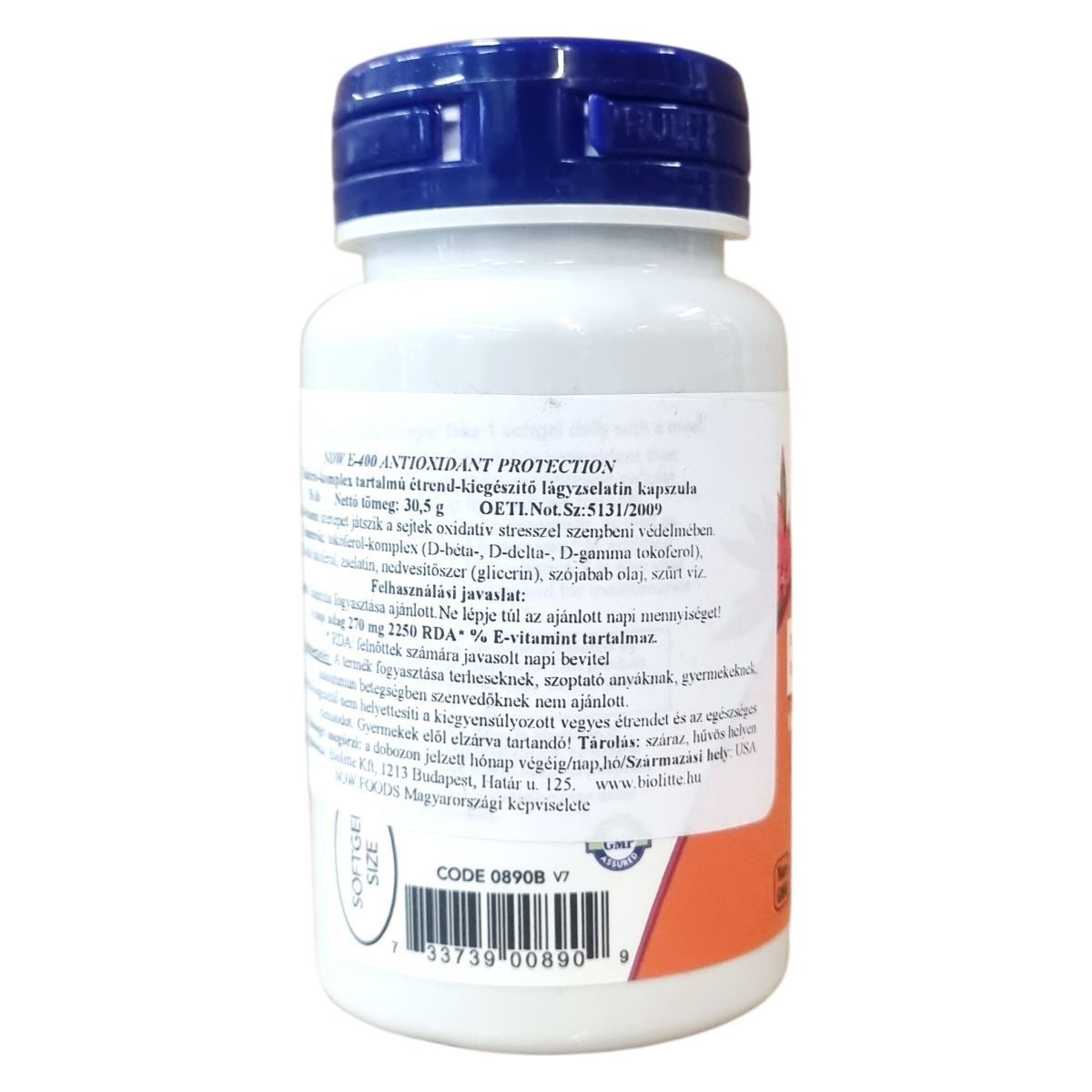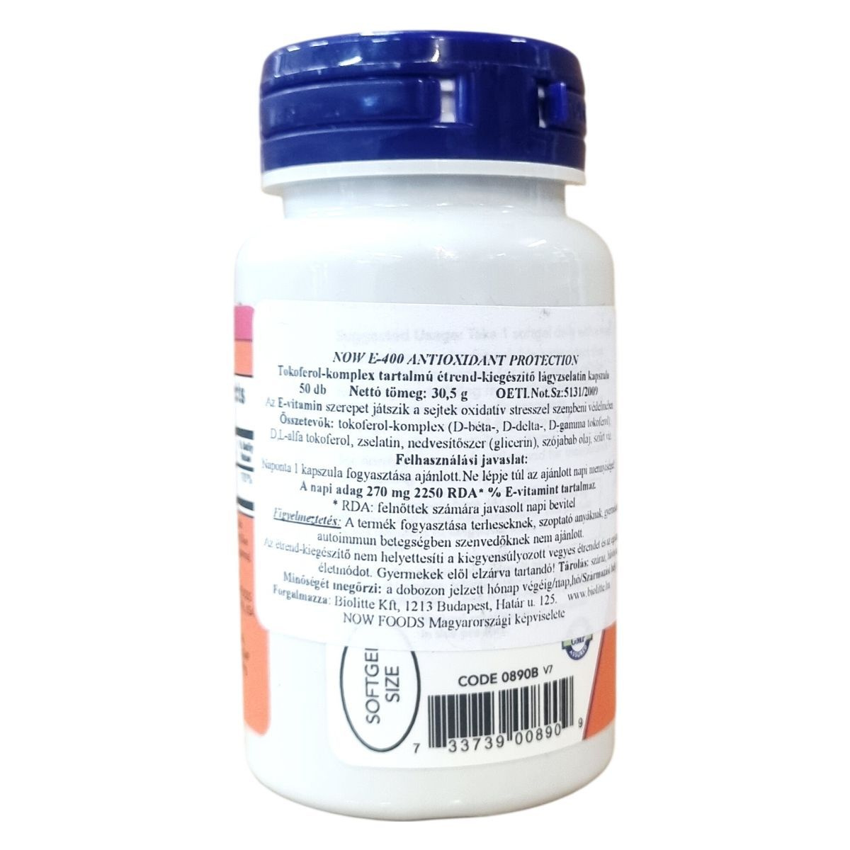 A NOW E-400 ANTIOXIDANT PROTECTION lágyzselatin kapszula tokoferol-komplexet tartalmaz, amely többféle tokoferolt foglal magába, így D-béta-, D-delta- és D-gamma tokoferolt is, valamint DL-alfa tokoferolt. A kapszula összetevői között megtalálható a bovin eredetű, BSE-mentes zselatin, glicerin, szűrt víz, organikus extra szűz olívaolaj és szójaolaj, mely utóbbi nem-genetikailag módosított szójából származik. A termék nem tartalmaz élesztőt, búzát, glutént, tejet, tojást, halat vagy kagylót, ugyanakkor olyan GMP környezetben készül, ahol allergéneket is kezelnek. Az ajánlott napi bevitel 270 mg E-vitamint biztosít, ami a felnőttek számára javasolt napi beviteli érték 2250%-a. A termék az USA-ban készül, és a Biolitte Kft forgalmazza Magyarországon.