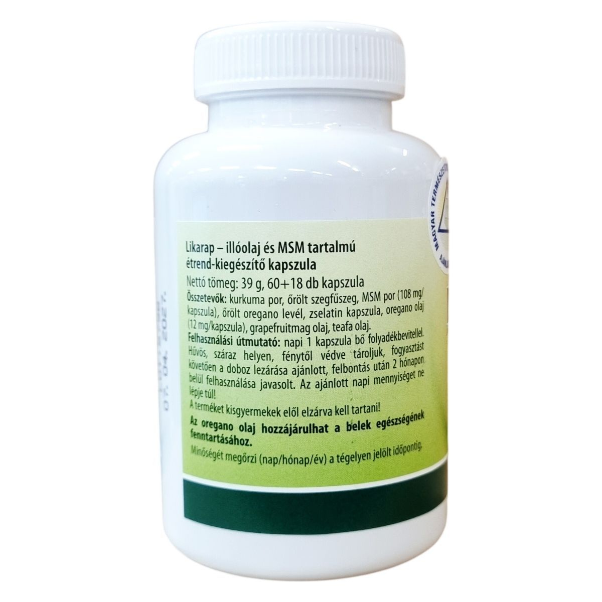 A Likarap kapszula illóolajokat és MSM-et tartalmaz, melyek különböző formákban járulhatnak hozzá a szervezet támogatásához. Az oregano olaj hozzájárulhat a belek egészségének fenntartásához. A termék összetevői között kurkuma por, őrölt szegfűszeg, oregano levél, zselatin kapszula, grapefruitmag olaj és teafa olaj szerepelnek. Az étrend-kiegészítő nem helyettesíti a kiegyensúlyozott vegyes étrendet és az egészséges életmódot. A grapefruitmag olaj a gyógyszerek hatását erősítheti, ezért gyógyszert szedőknek orvosi tanács kérését javasoljuk. A teafaolaj miatt a terméket 18 éven aluliak, terhes és szoptató nők nem fogyaszthatják.