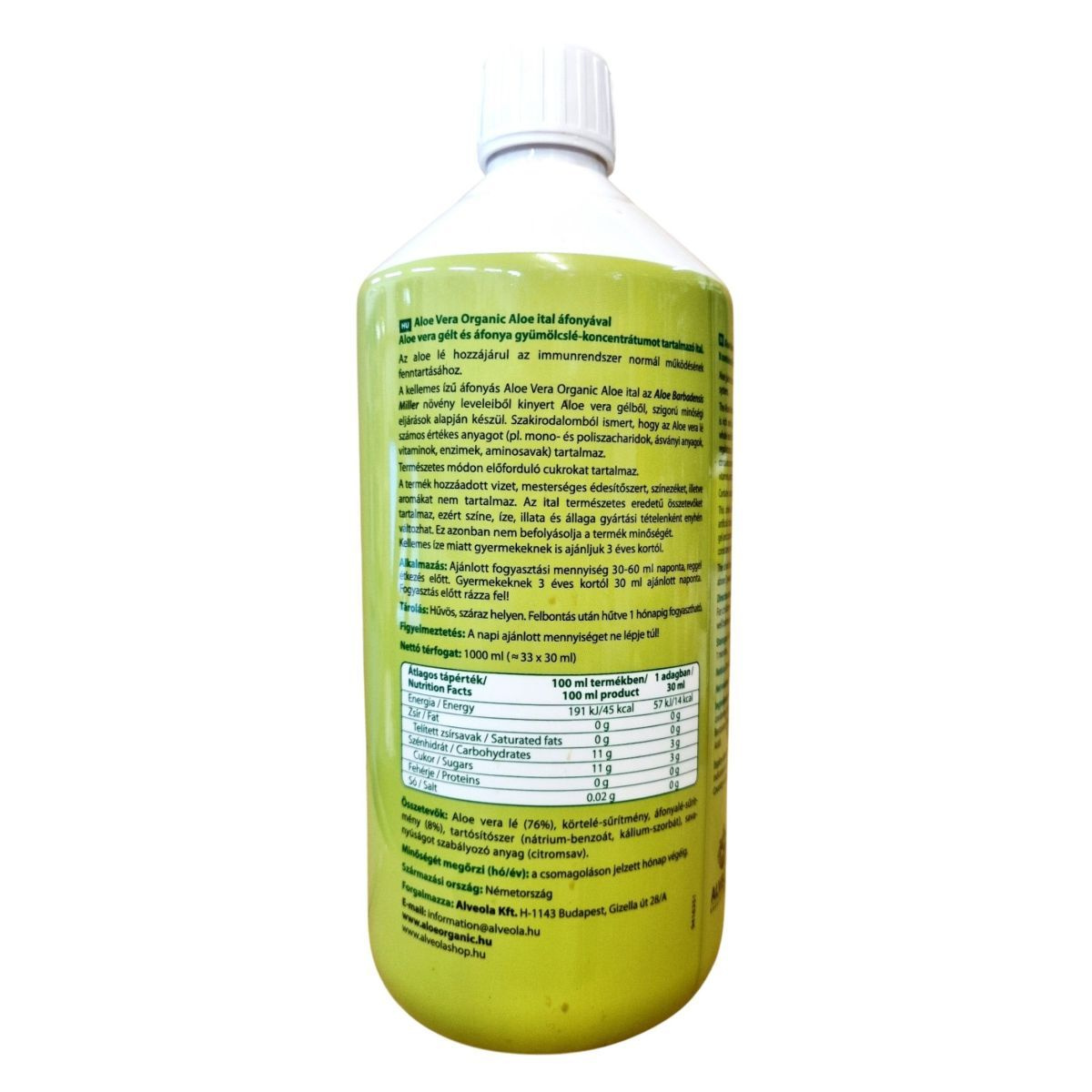Az Aloe Vera Organic áfonyás ital természetes, vegán, gluténmentes és mesterséges adalékanyagoktól mentes frissítő ital, amely organikus termesztésből származó aloe vera gélt tartalmaz. Az aloe növény leveleiből kinyert gél számos biológiailag aktív összetevőt hordoz – köztük poliszacharidokat, aminosavakat, enzimeket és vitaminokat –, melyek segíthetik a szervezet általános vitalitásának fenntartását. A lágyan savanykás ízű ital természetes módon tartalmaz cukrokat, és nem tartalmaz mesterséges színezéket vagy édesítőszert. A gyümölcsös ízvilág és az aloe frissítő hatása miatt gyermekeknek is ajánlott hároméves kortól. Származási helye Németország, a termék minőségét az Alveola Kft. garantálja.