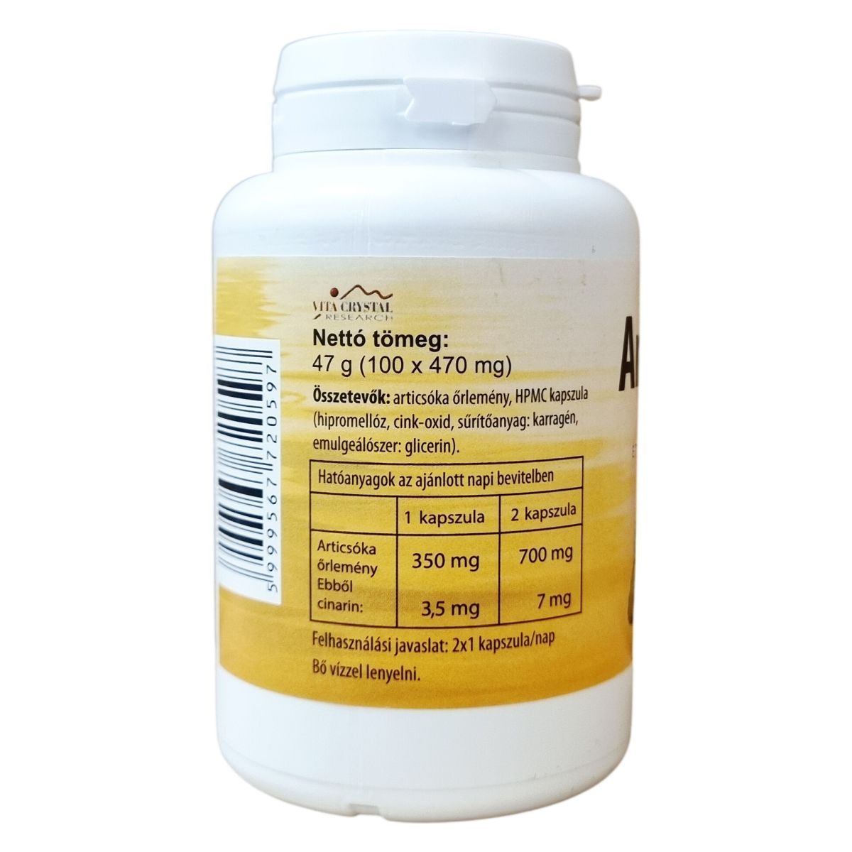 A Vita Crystal Articsóka kapszula nettó tömege 47 g, 100 darab 470 mg-os kapszulát tartalmaz. Az articsóka őrleménye mellett a kapszula anyaga HPMC, amely hipromellózt és cink-oxidot tartalmaz, továbbá sűrítőanyagként karragént és emulgeálószerként glicerint. A termék pontos adagolása, összetevői és tárolási javaslatai hozzájárulhatnak a kényelmes használathoz és a hatóanyagok megőrzéséhez.